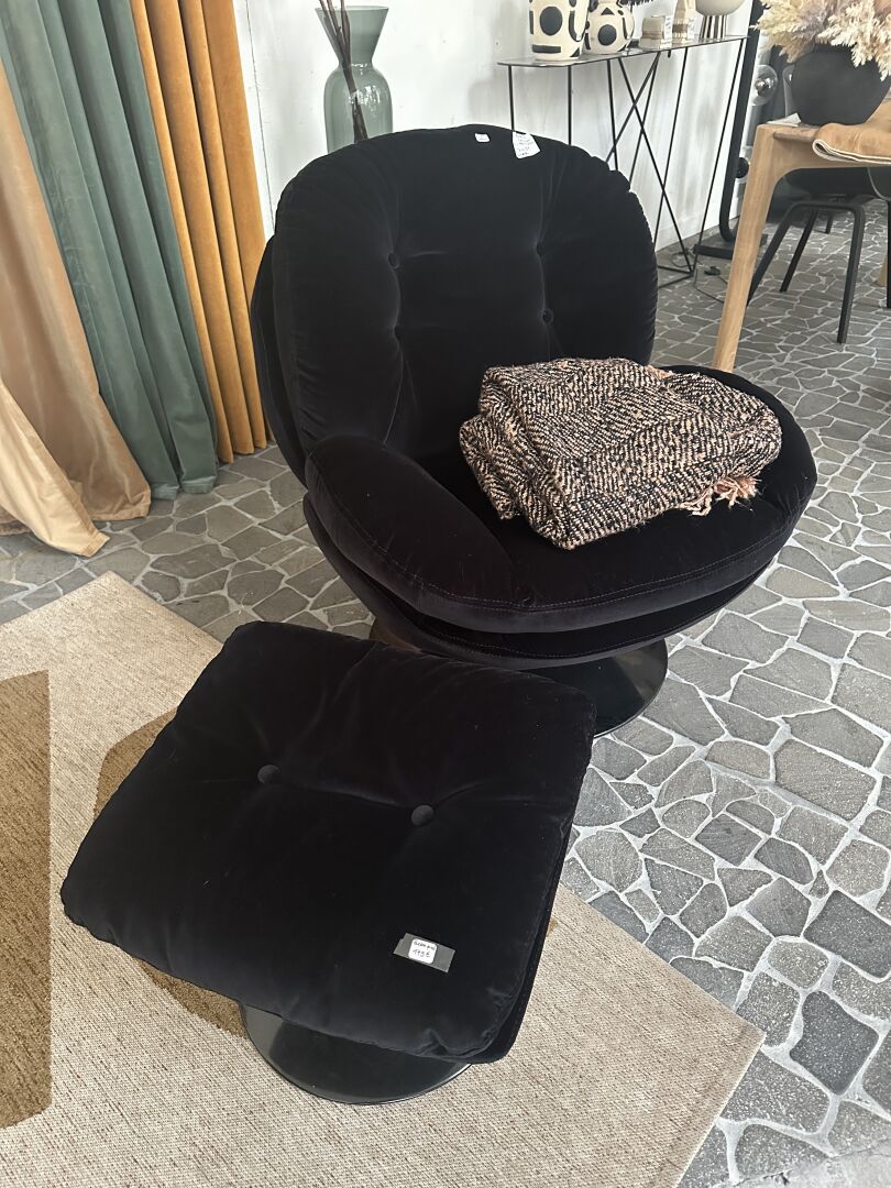 1 fauteuil tournant MEMENTO, tissus velour noir, base métal noire, avec son repose pied, 1 plaid...