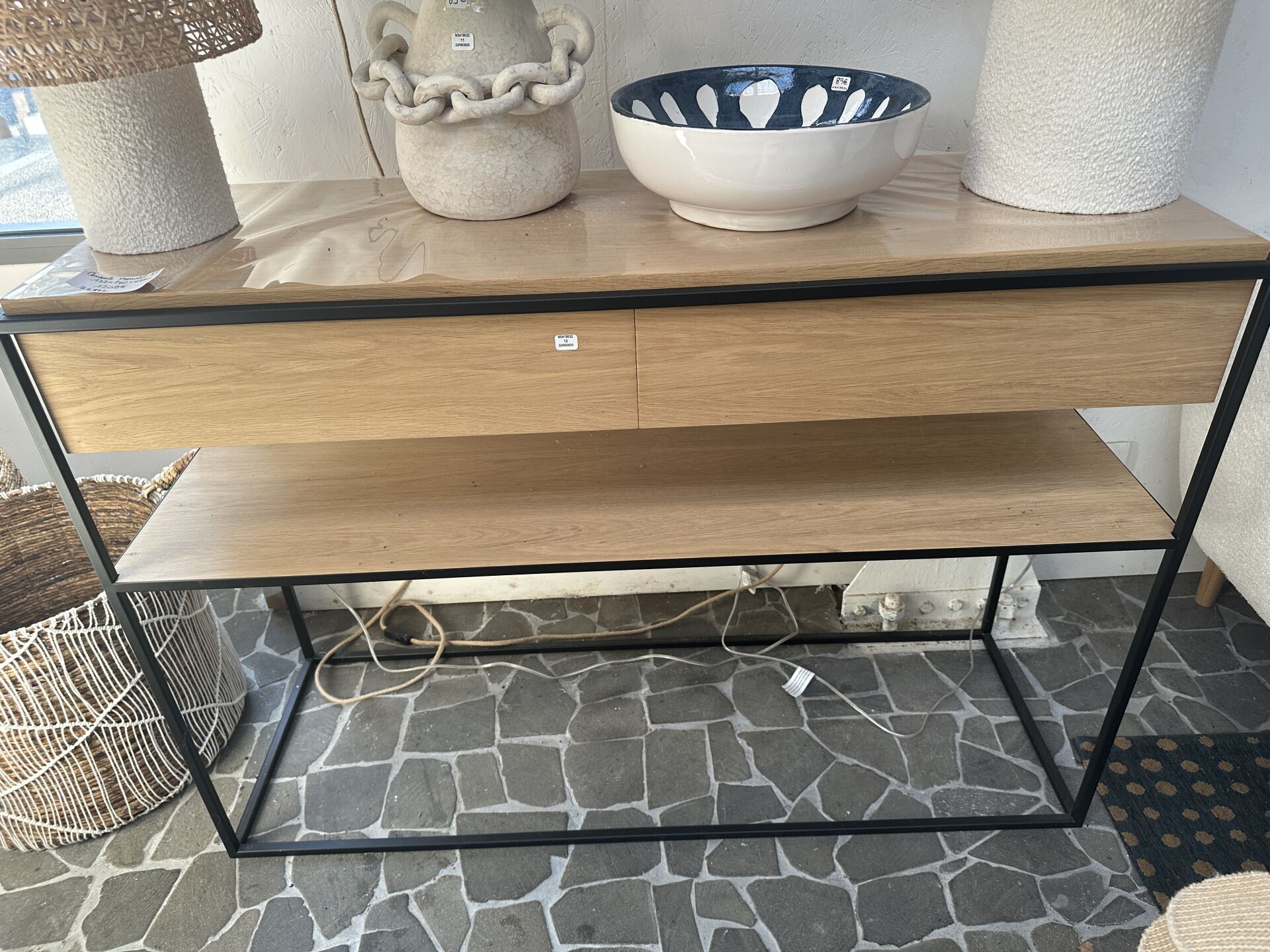 1 console monolite 2T piètement métal noir, bois clair,à 2 tiroirs, 122X40X85cm; Prix de vente...