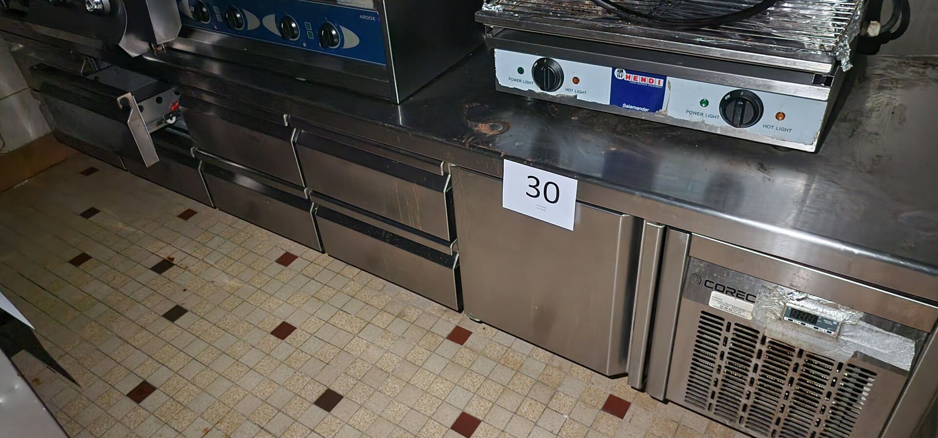 1 soubassement réfrigéré positif inox CORECO modèle MFB-270-C, 1 porte et 8 tiroirs, moteur...