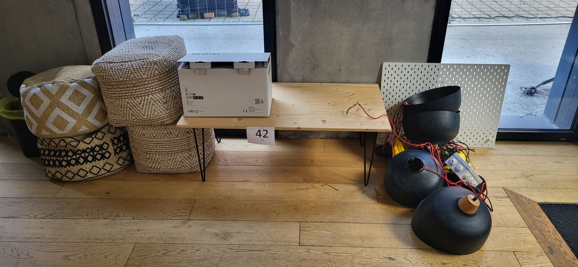 Table de travail six postes en quatre éléments contreplaqué : 2 en 220 x 60 cm et 2 en 110 x...