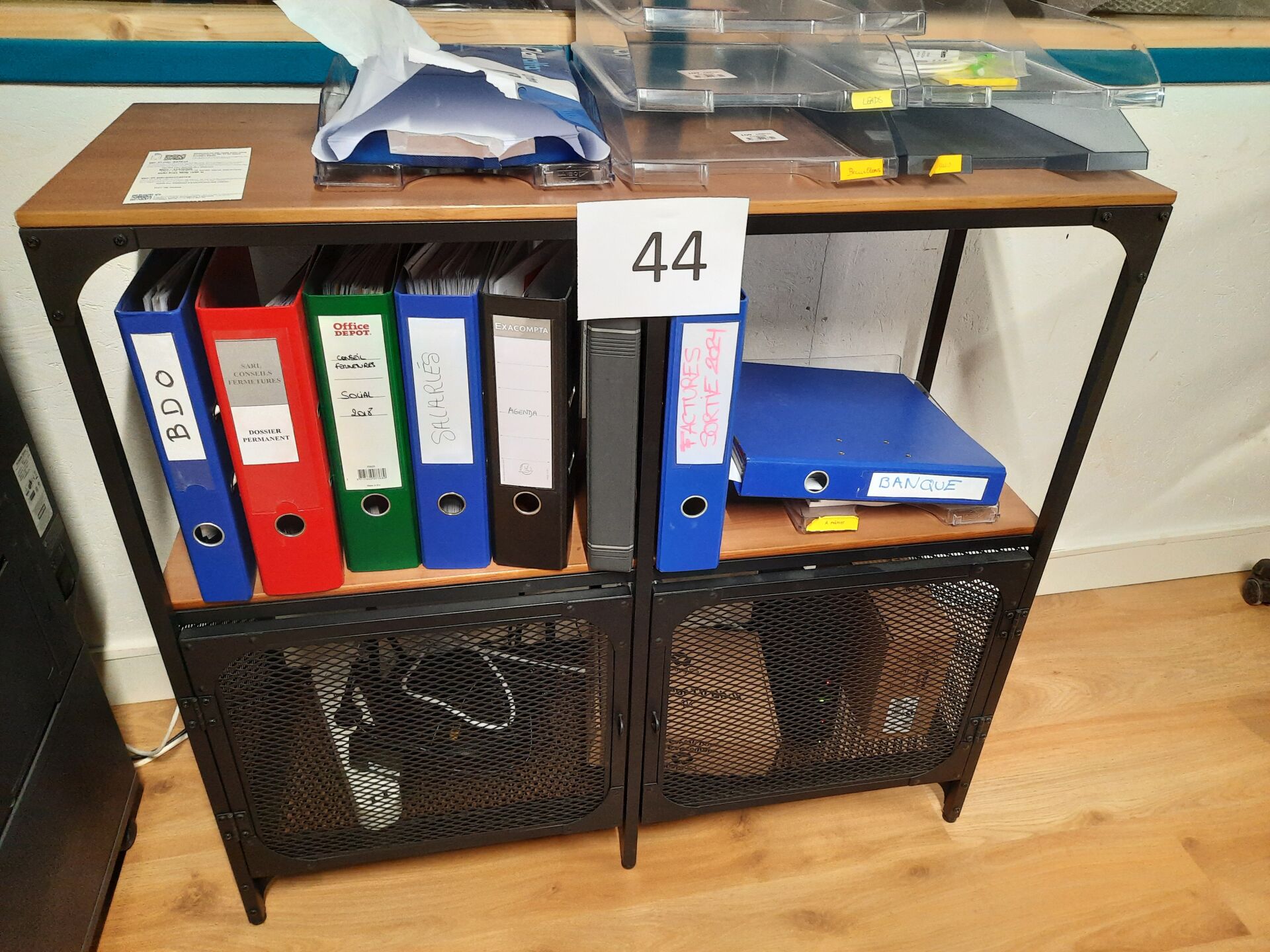 Étagère en métal laqué noir ey mélaminé façon bois, ouvrant à 2 vantaux