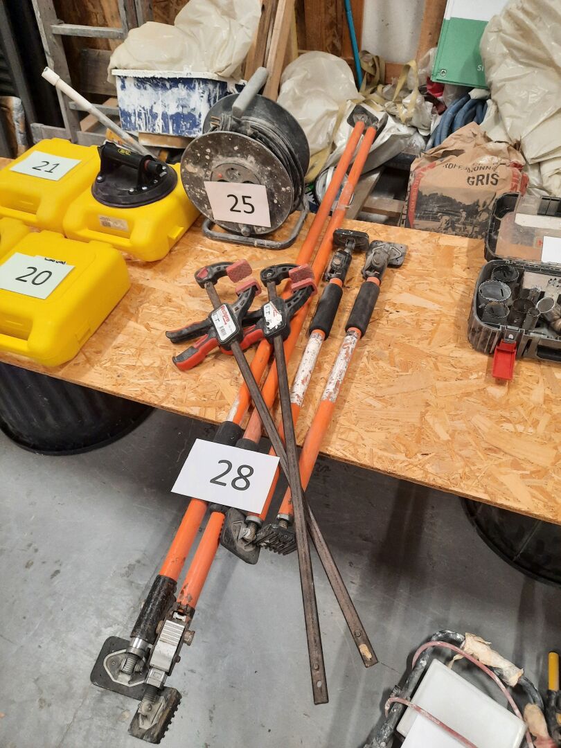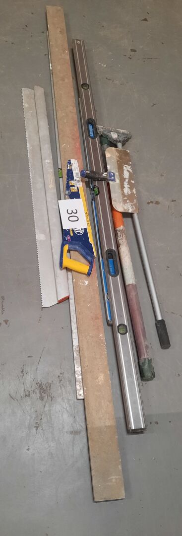 2 niveaux à bulle, 2 règles en aluminium, scie égoïne, jeu de baguettes de tirage, lame...