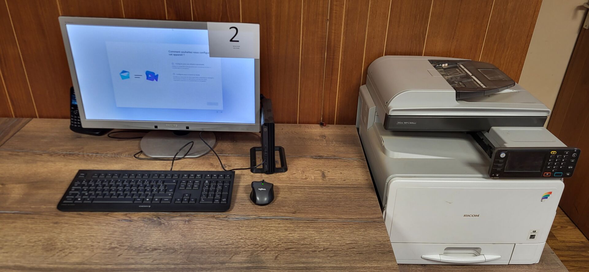 1 bureau d’angle mélaminé façon bois 250 x 200 cm avec partie basse pour copieur