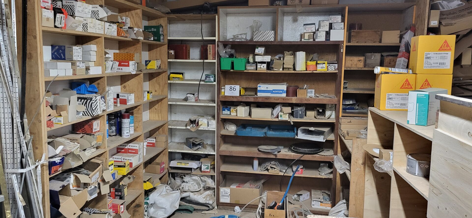Stock de panneaux de bois (contreplaqué et okoumé), de visserie, de coudes et manchons,...