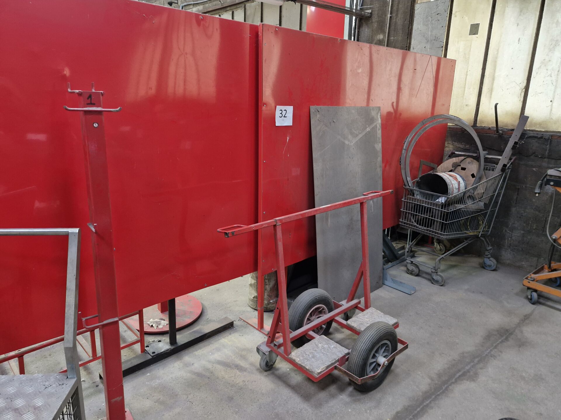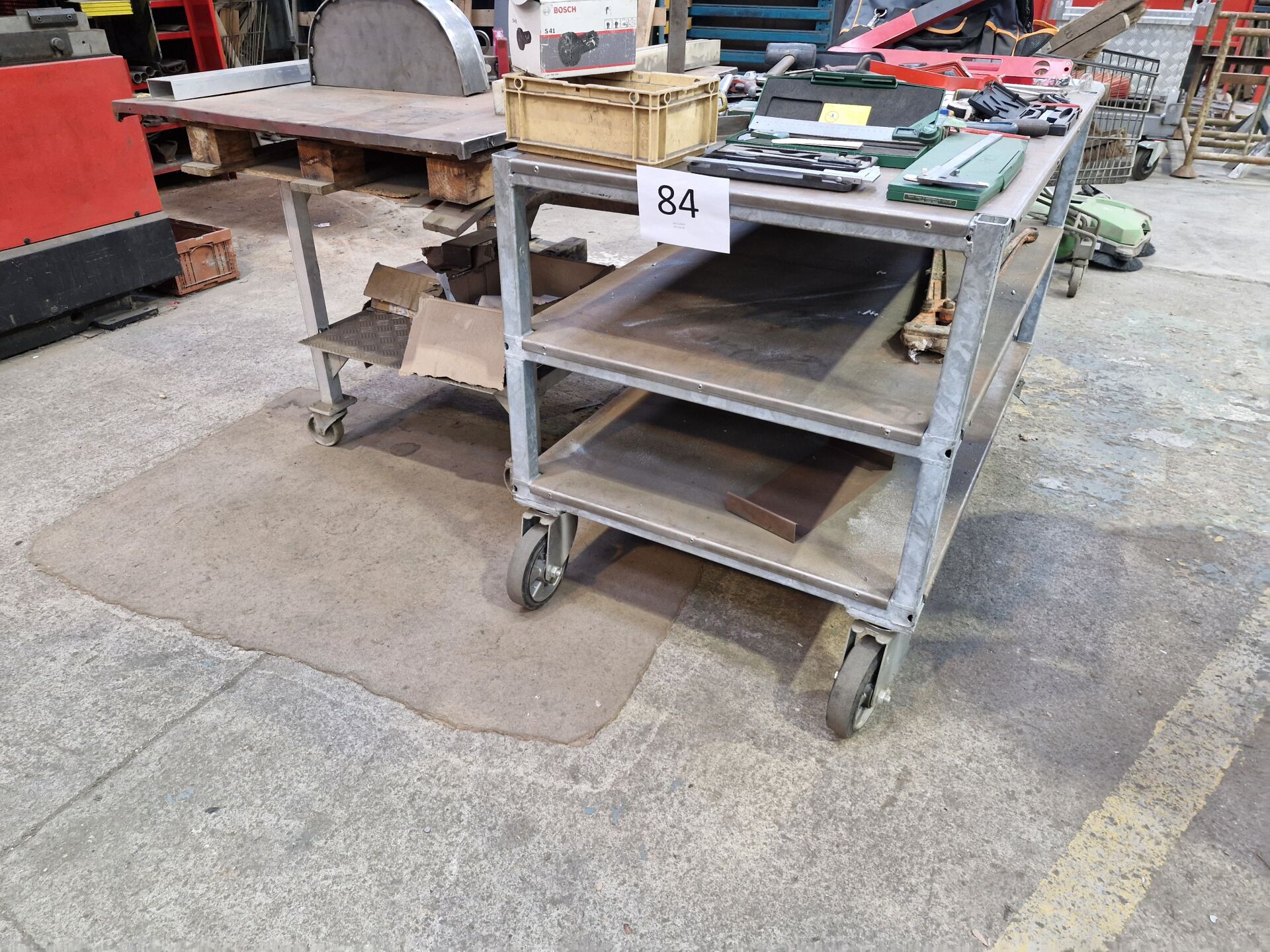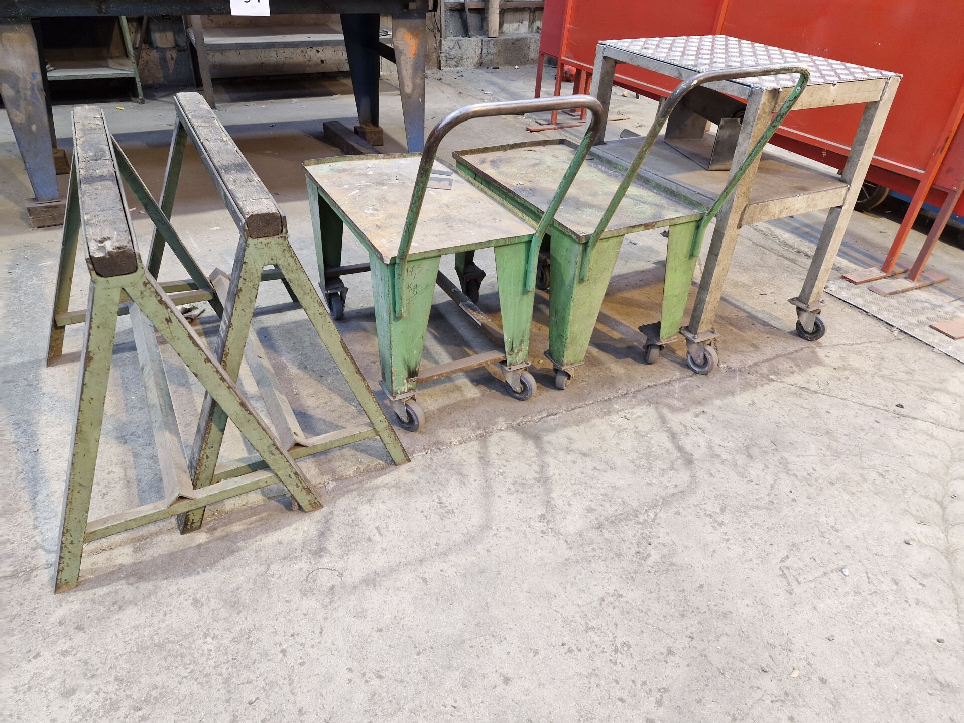 2 rateliers métalliques, 1 chariot métal avec bac galva 80 x50 cm, 2 servantes à rouleau