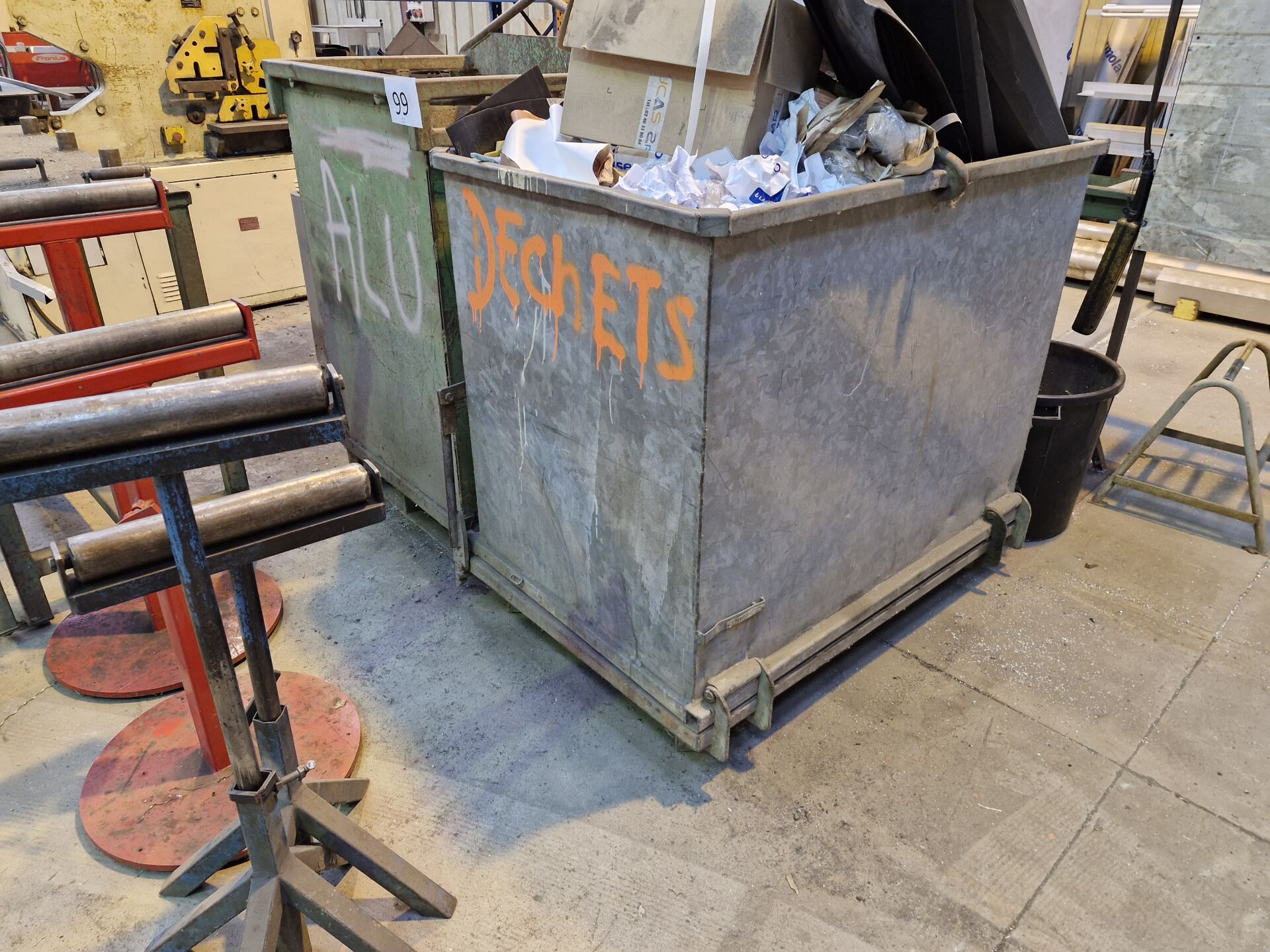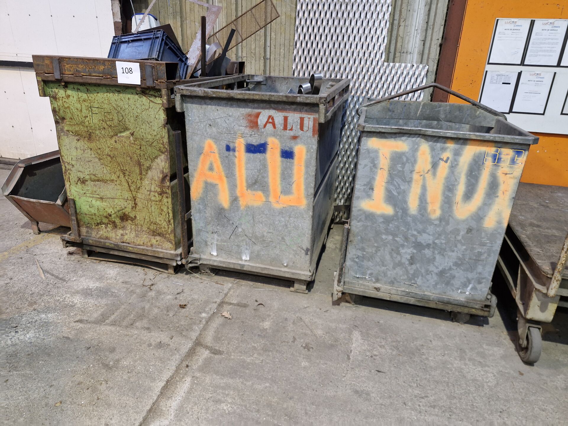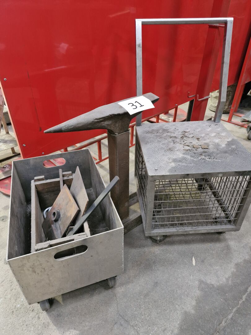 2 rateliers métalliques, 1 chariot métal avec bac galva 80 x50 cm, 2 servantes à rouleau
