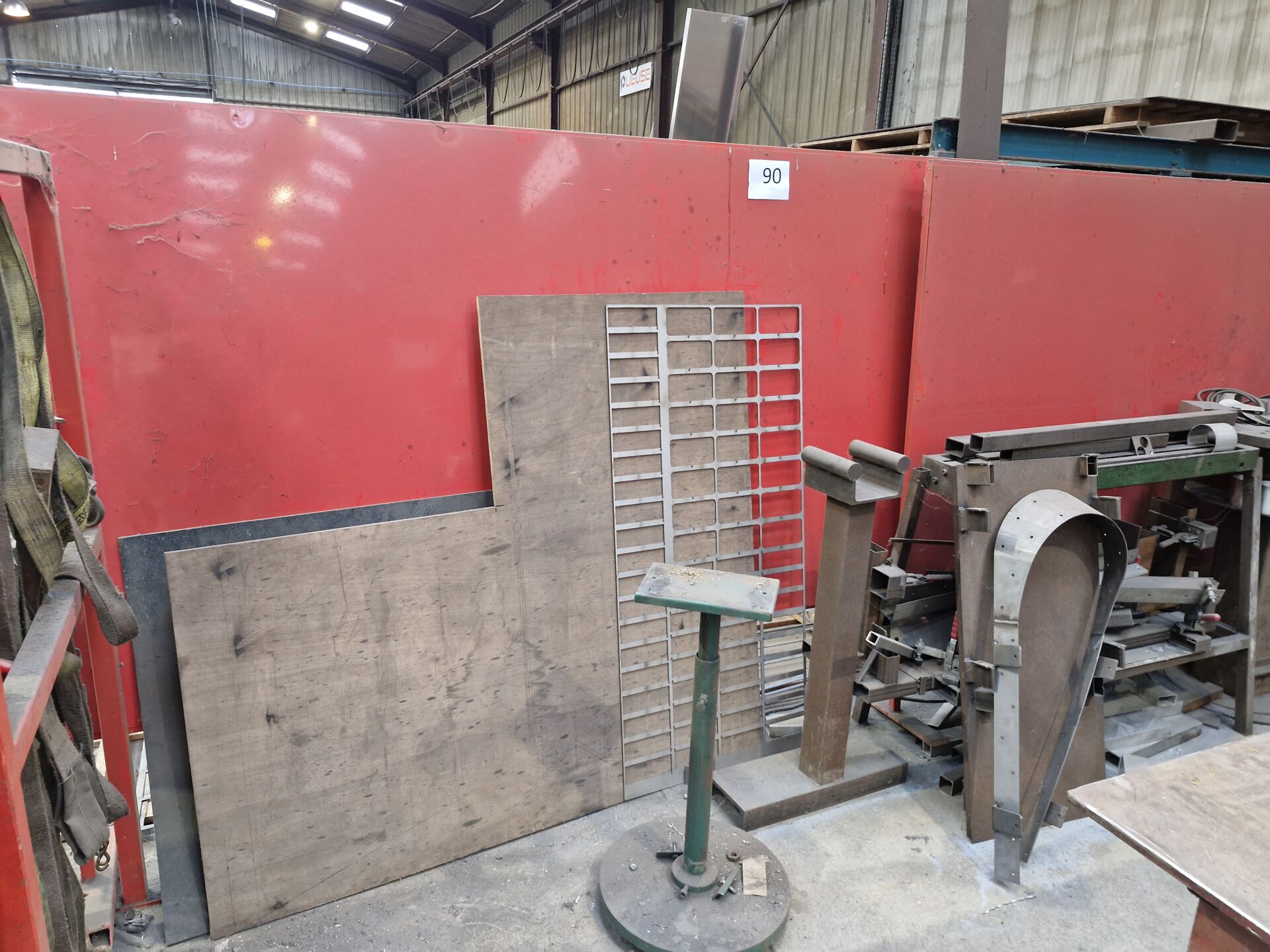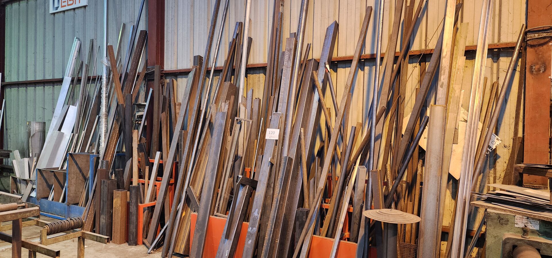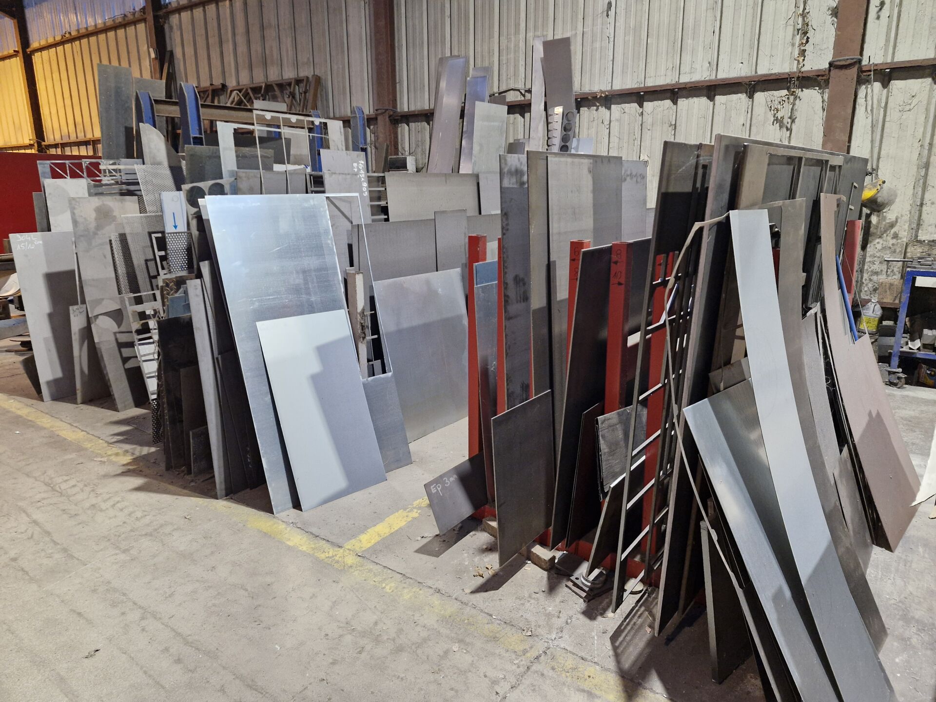 Dans 3 rateliers verticaux à tôles : 1 ensemble de chutes de tôles : acier, alu, inox, galva,...