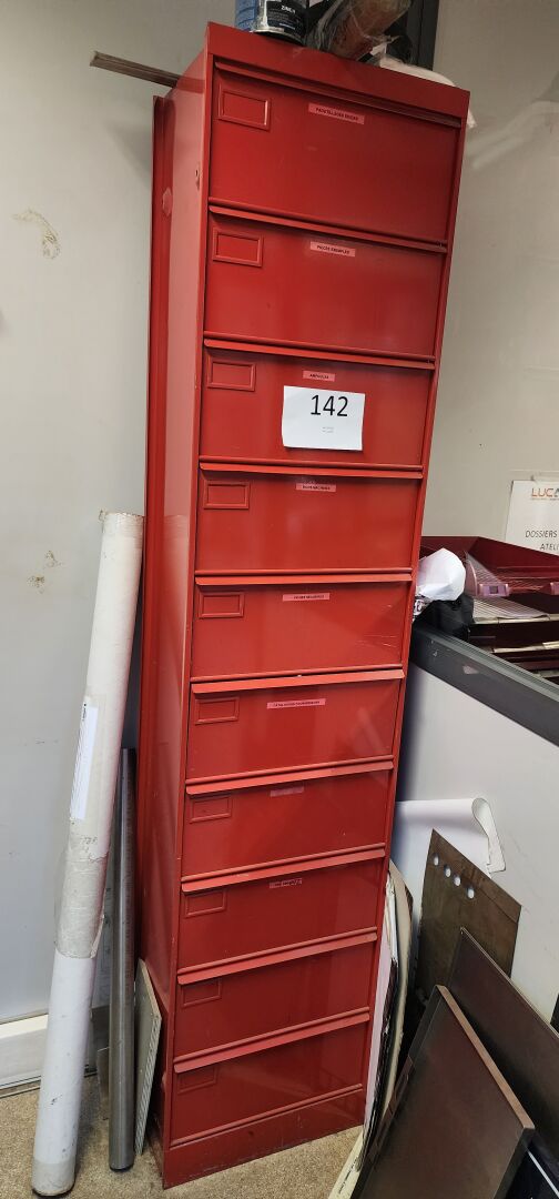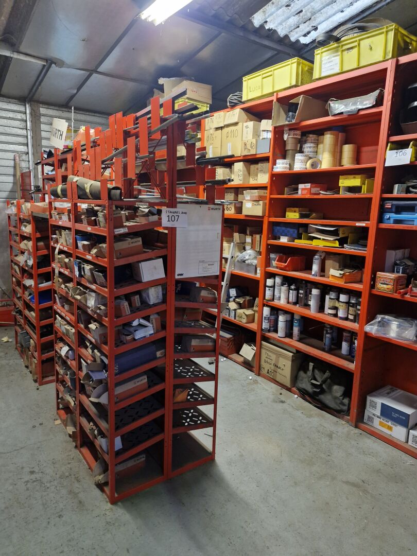 18 travées de rayonnages à quincaillerie métal laqué rouge dont largeur 100, 130 et 50 cm Adjugé à : €