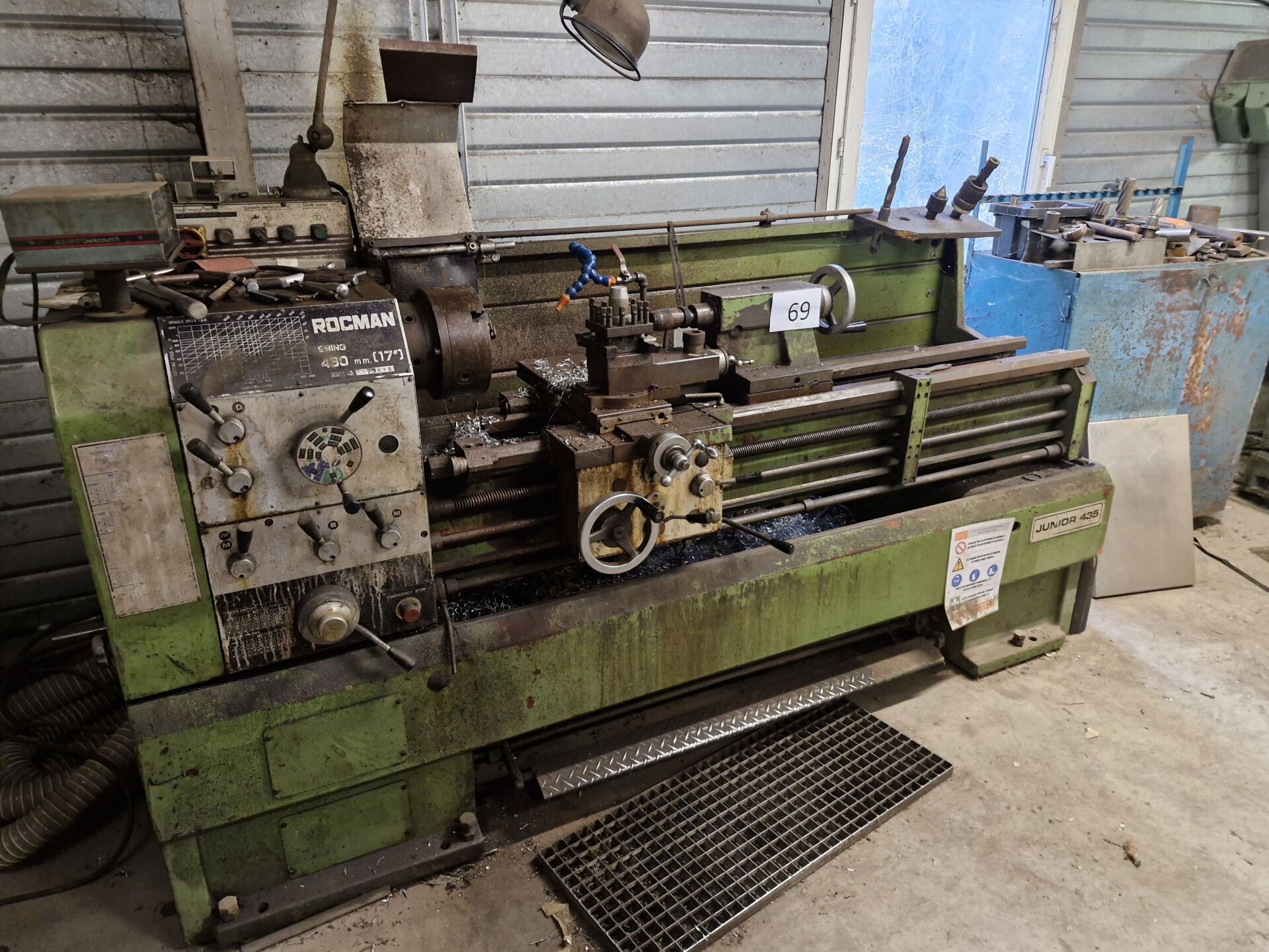 1 tour parallèle ROCMAN Swing 430 mm UNIOR 435 avec lampe JIELDE et 1 meuble avec outillage