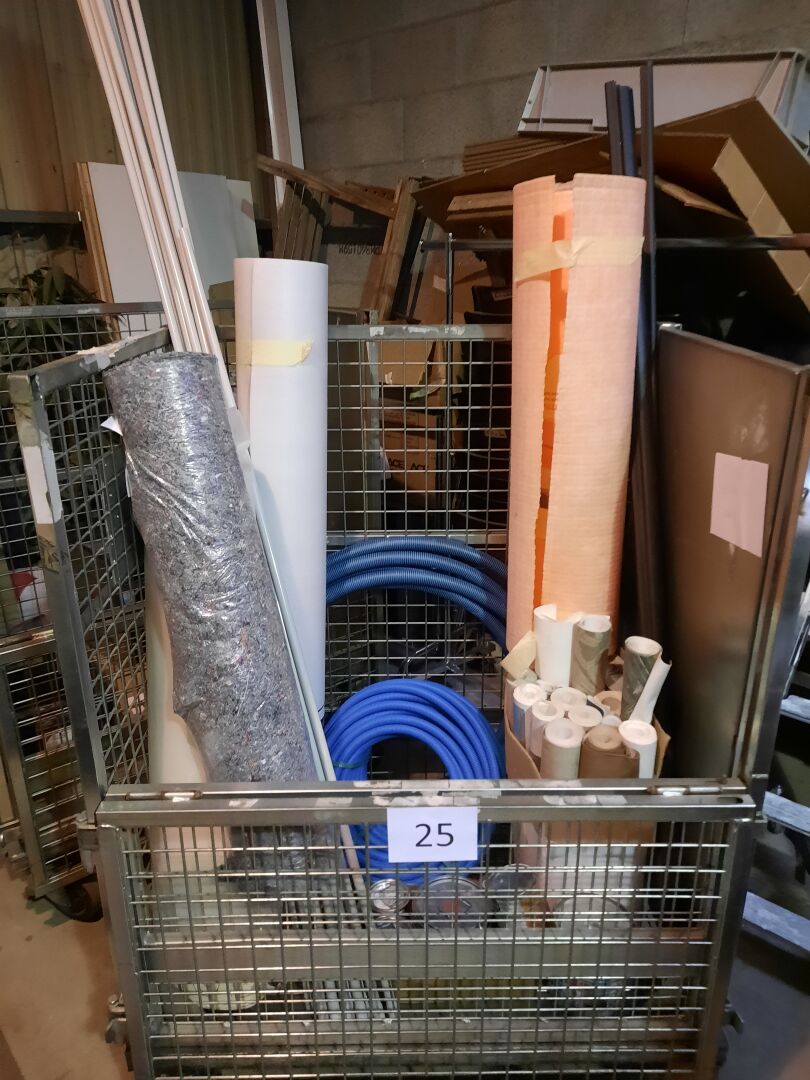 Stock de pots de peinture entamés, de rouleaux PVC, de sous-couche revêtement de sol, de gaines...