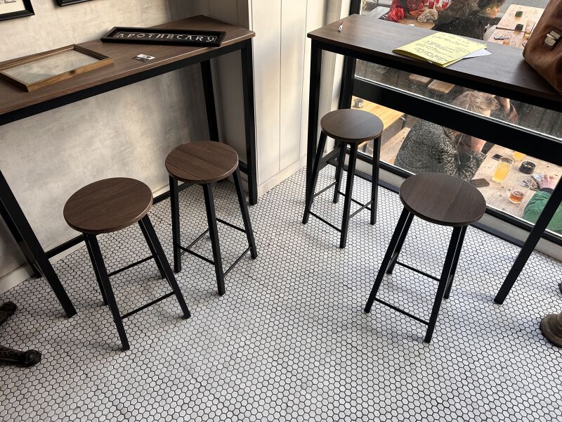 2 mange-debout, rectangulaires, à plateau en mélaminé façon bois, piètements tubes carrés...