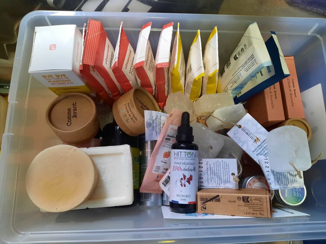 Stock de produits d’hygiène (bicarbonate de soude, savon noir, vinaigre blanc, nettoyant...