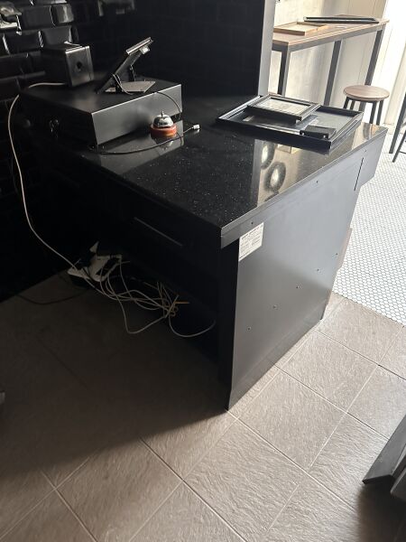 Meuble de caisse en métal laqué noir, ouvrant à 2 tiroir en ceinture, style industriel, dessus...