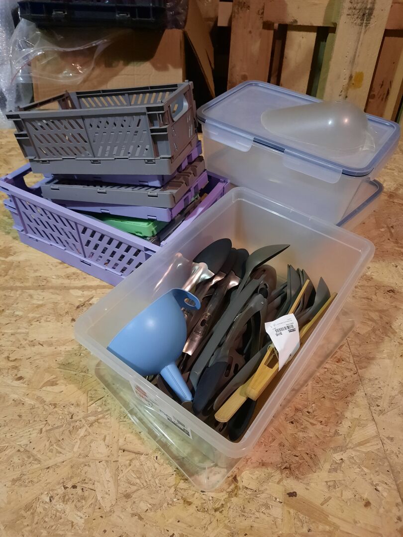 Petit lot d’ustensiles de cuisine dont pinces, cuillères, entonnoirs, caisses en pvc