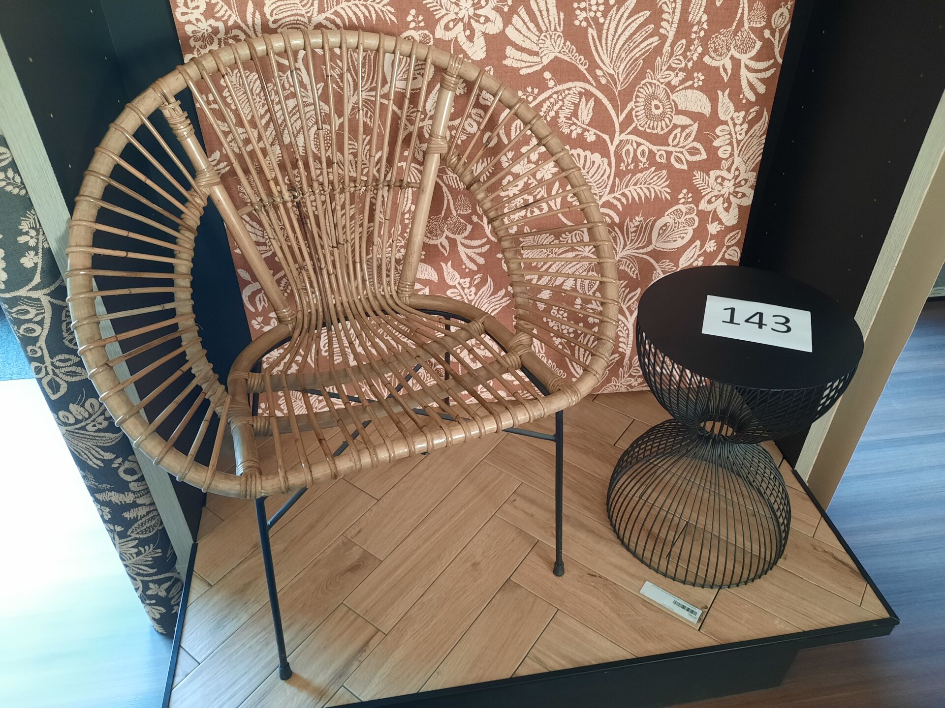 Fauteuil en osier tréssé et métal laqué noir, table basse de forme diabolo en métal laqué...