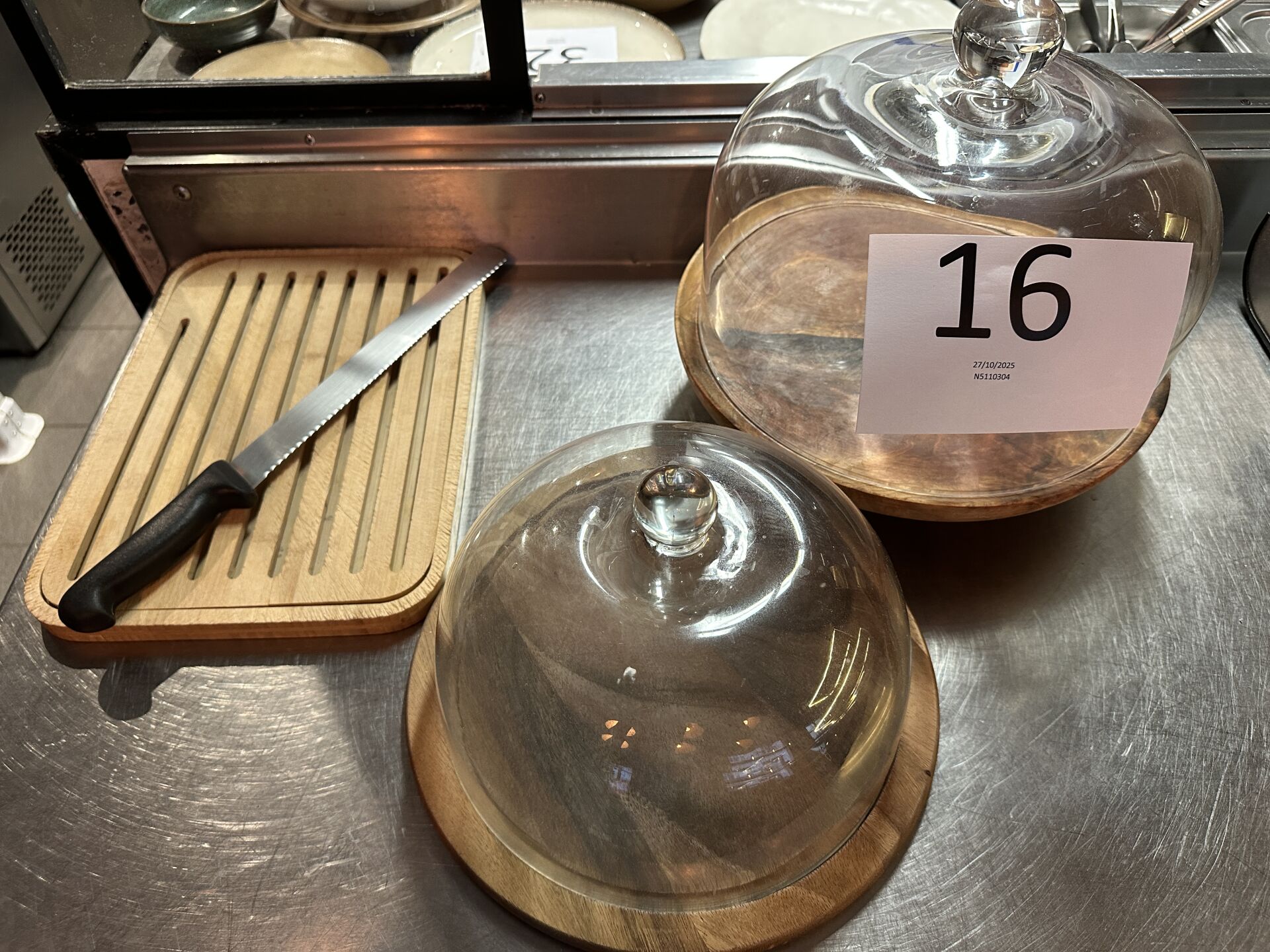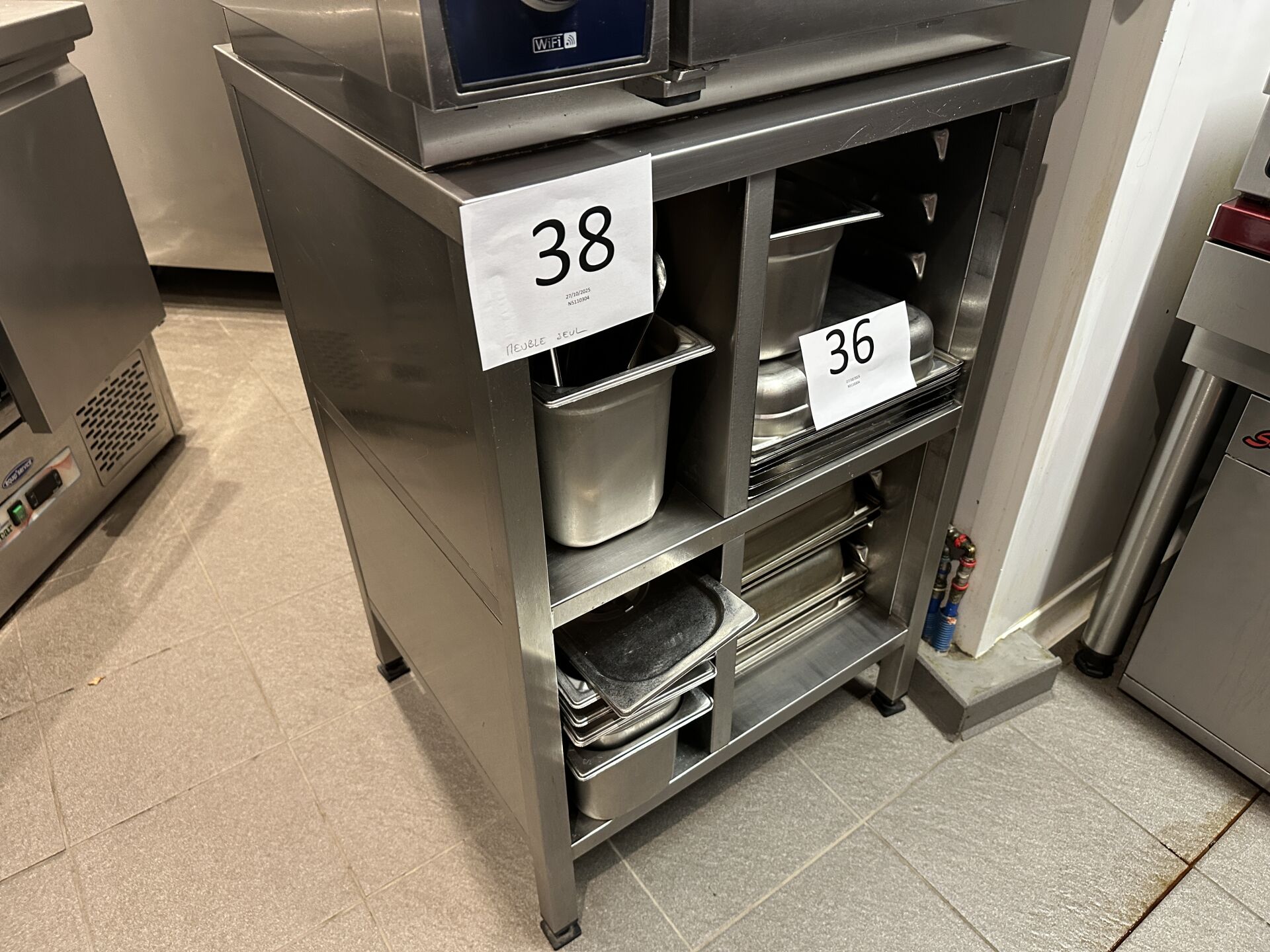 1 desserte en inox, à double tablette d’entrejambe (90 x 60 x 90 cm) et dosseret