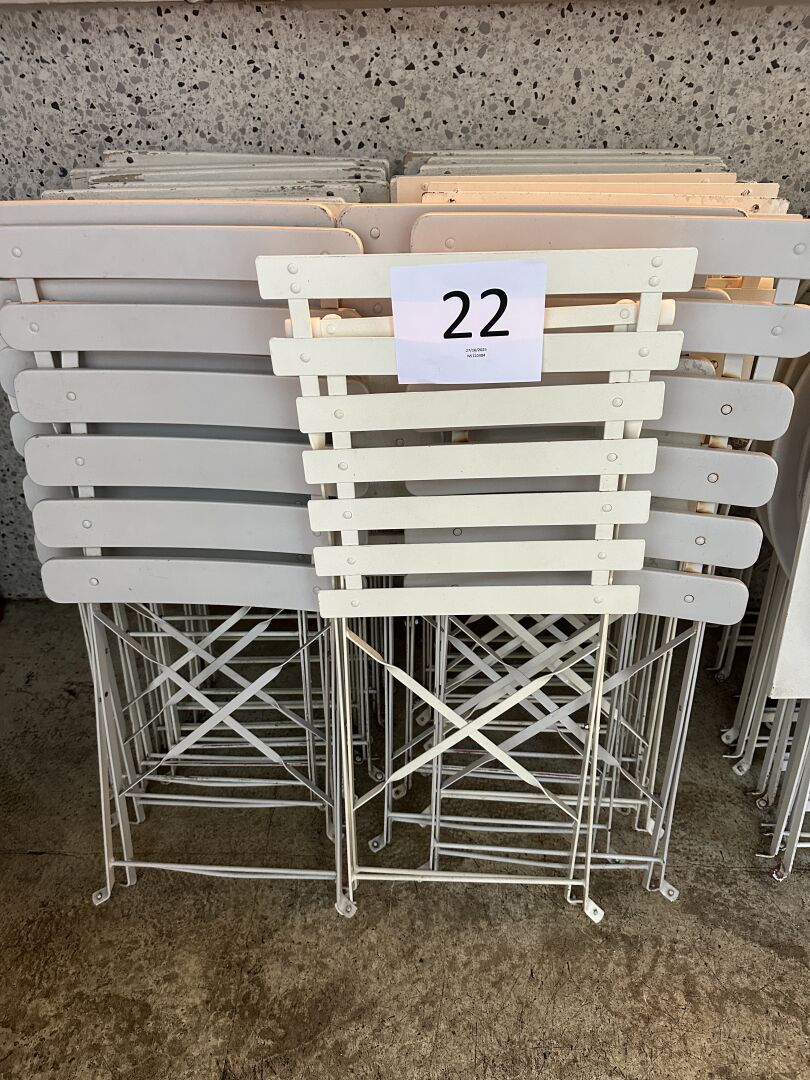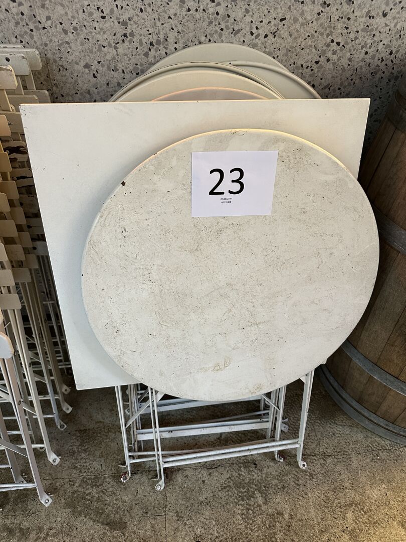 12 tables de terrasse, 2 couverts, pliables en métal blanc (11 à plateau rond diam 60 cm, et 1...
