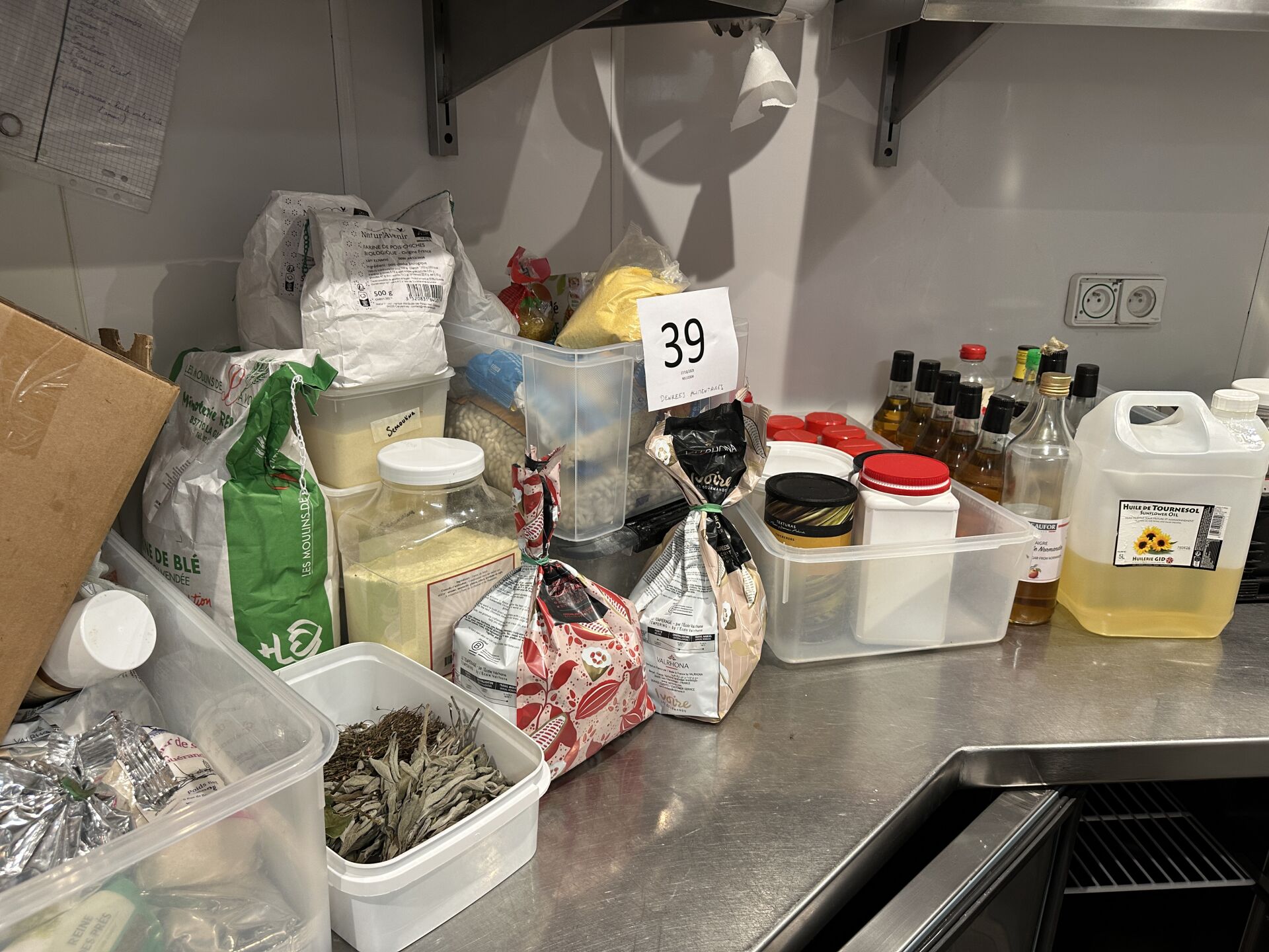 1 stock de denrées et produits alimentaires dont entamés : farine (de blé, maïs, poids...