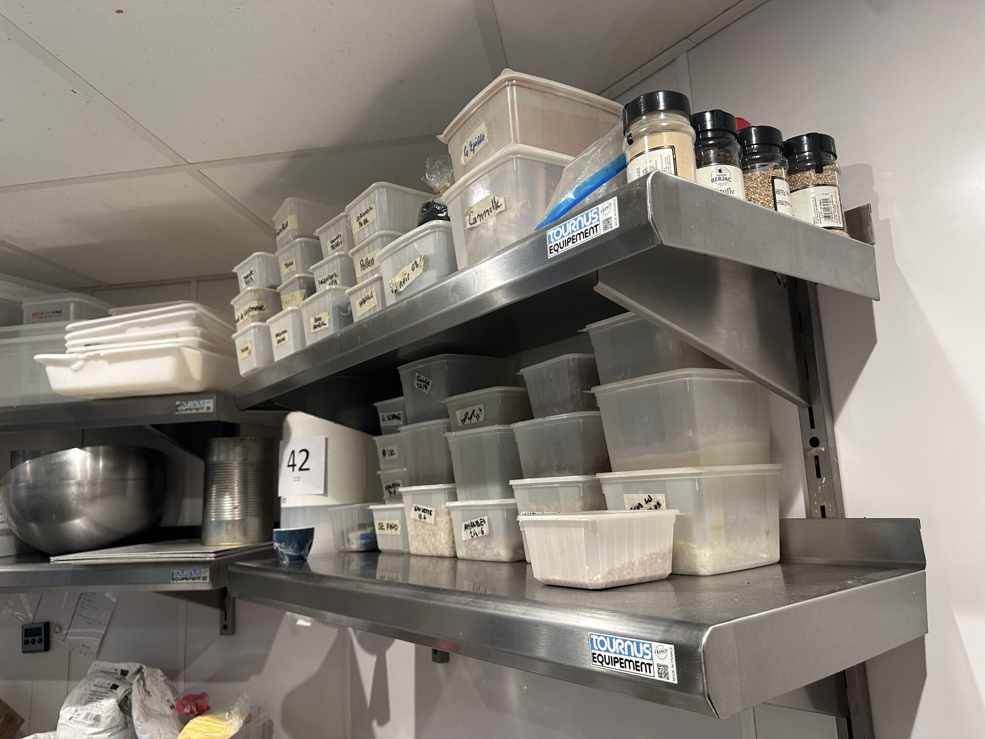 4 étagères murales en inox sur équerres dont 2 (180 x 11 x 39 cm) et 2 (100 x 11 x 39 cm) + 2...