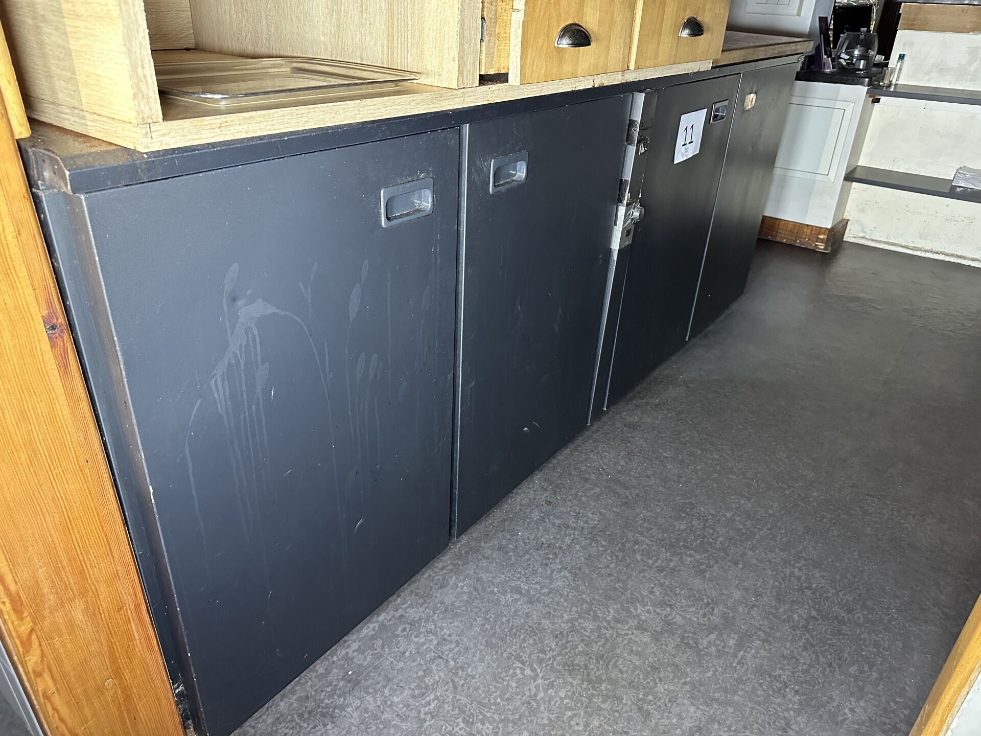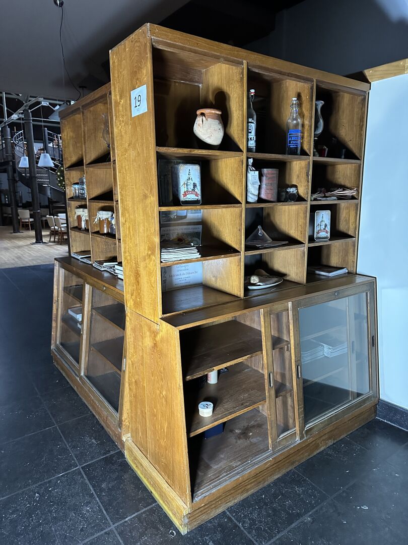 1 meuble mi-hauteur mélaminé façon bois et gris, 1 porte