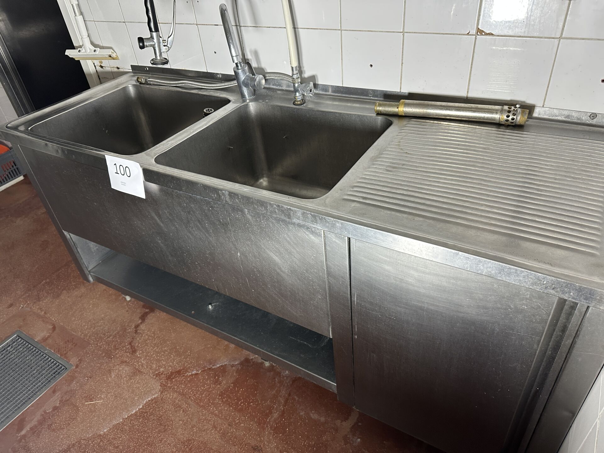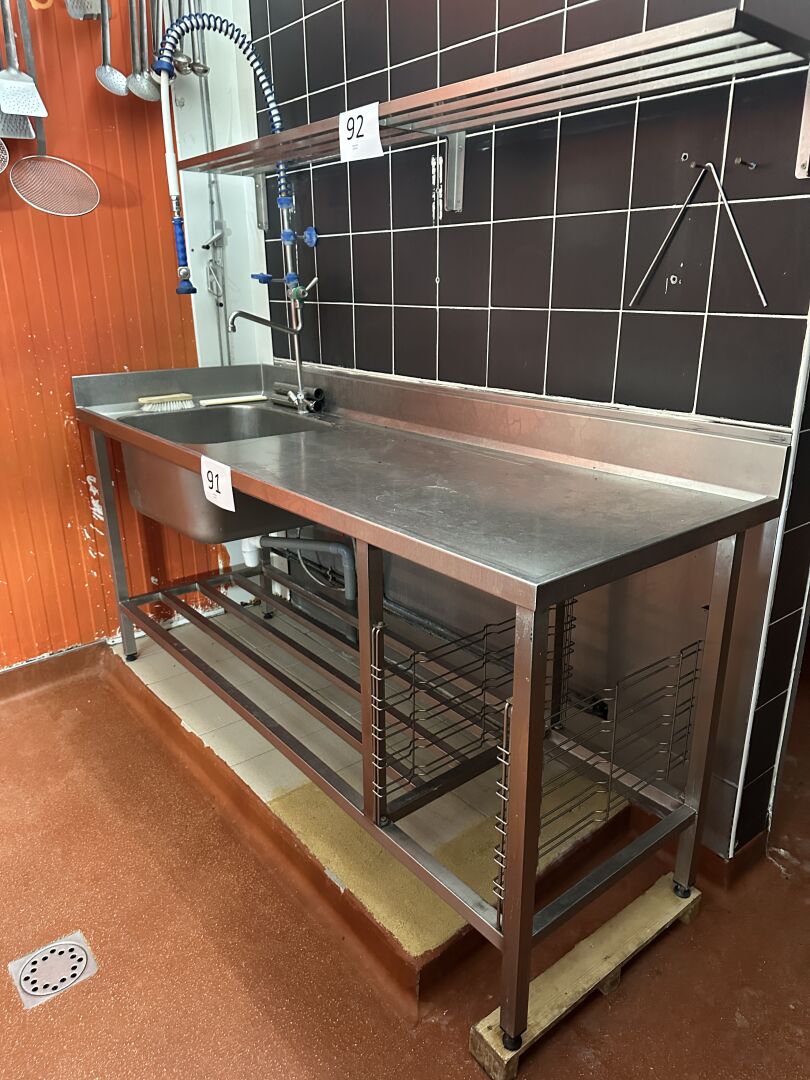 1 plonge inox 2 bacs égouttoir à droite avec douchette, 1 porte, 190x65cm