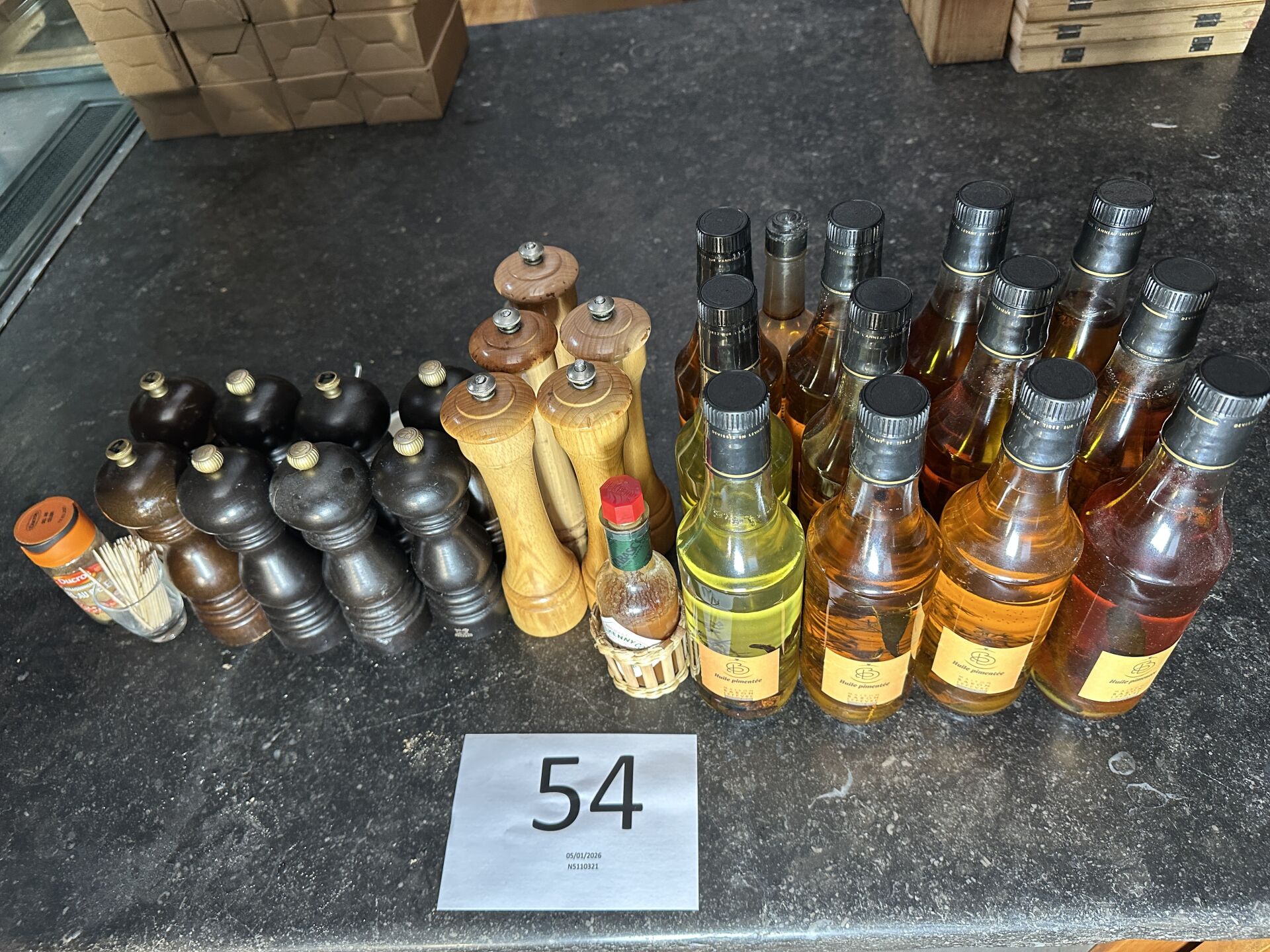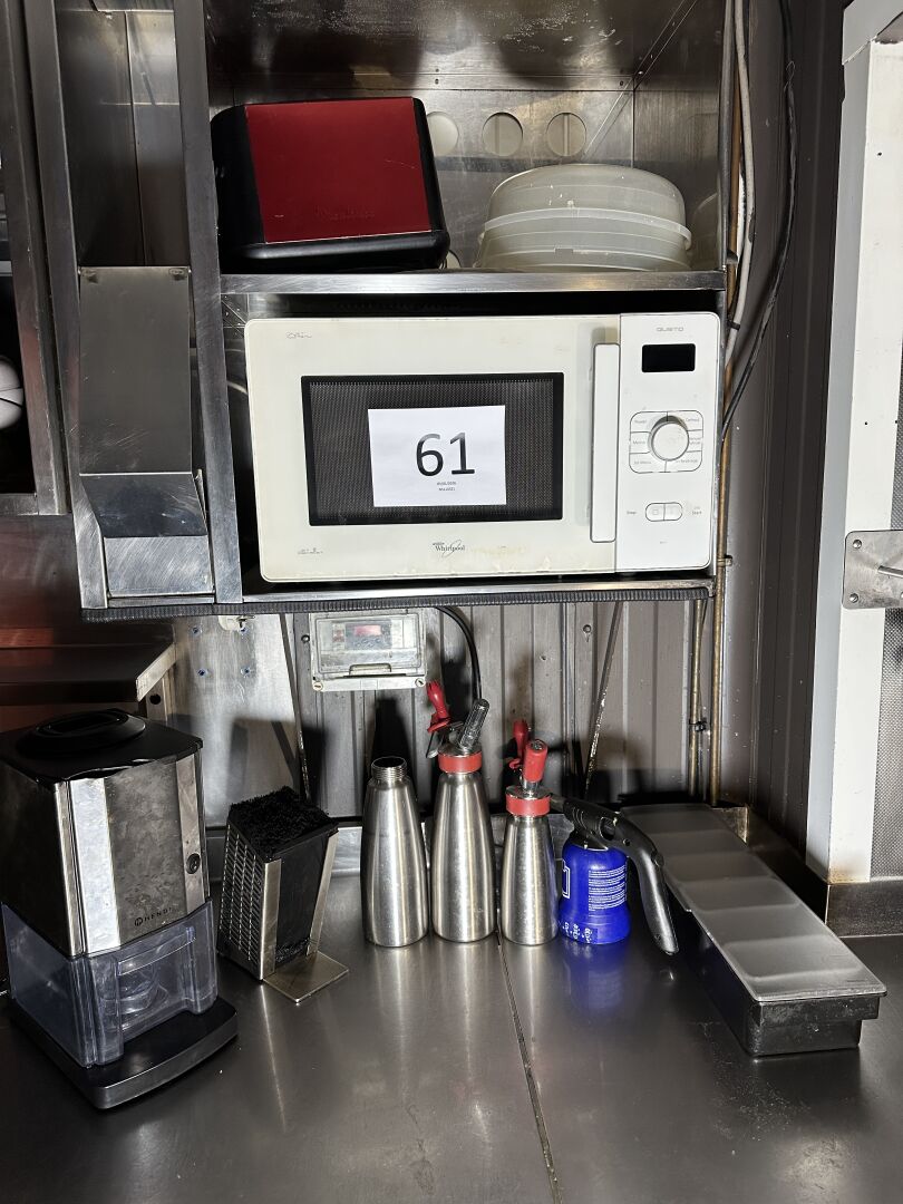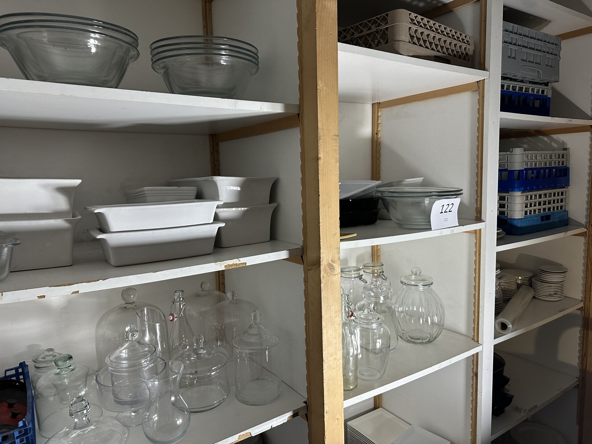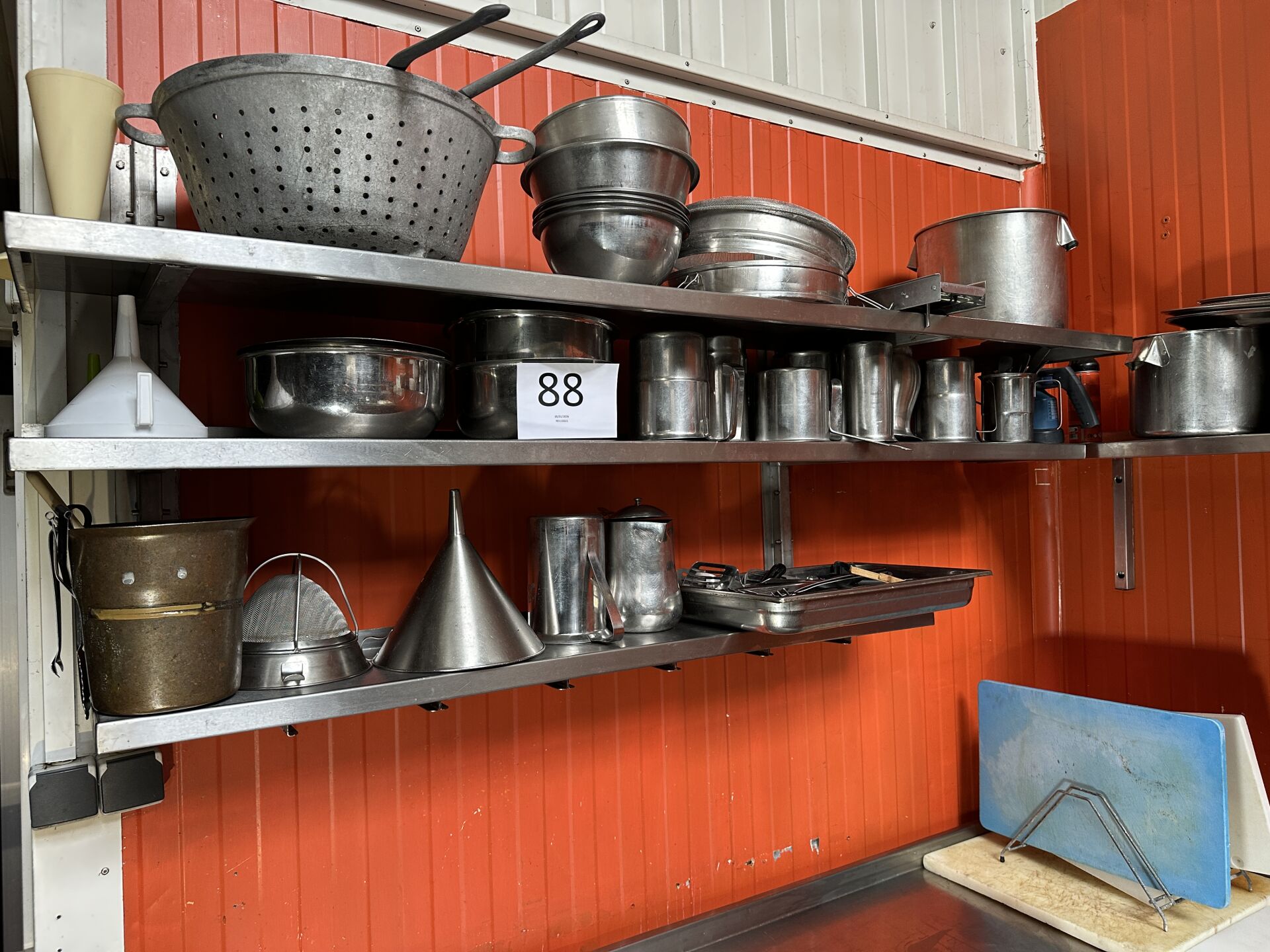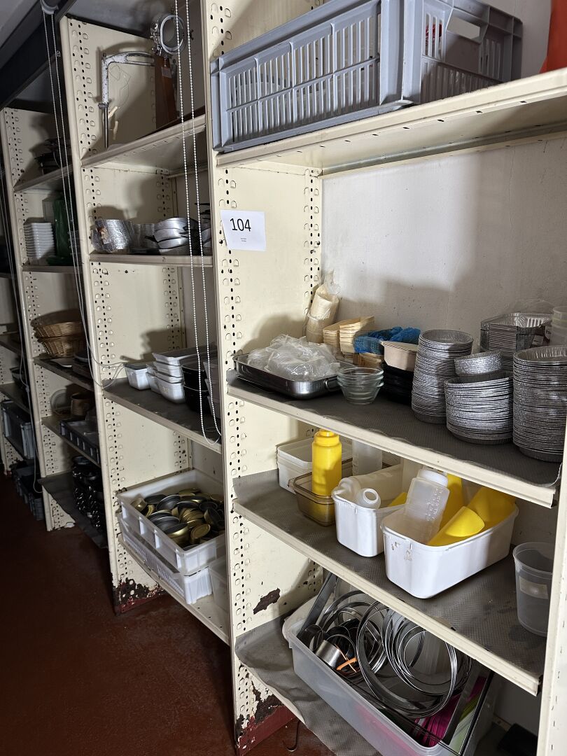 Dans un couloir : sur 1 étagère, 1 ensemble d’ustensiles et accessoires de cuisine dont...