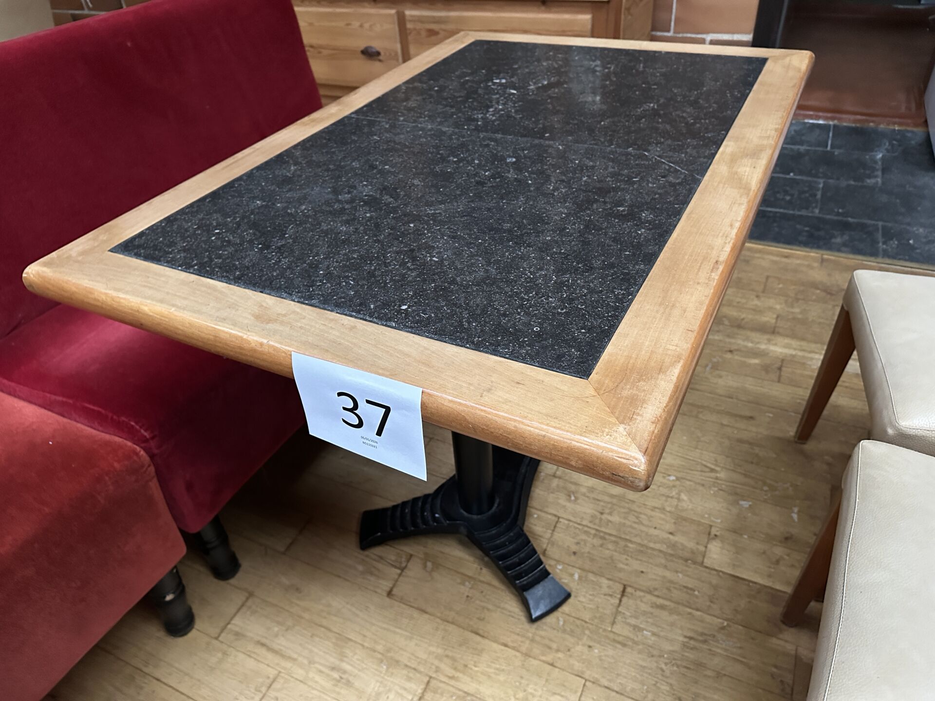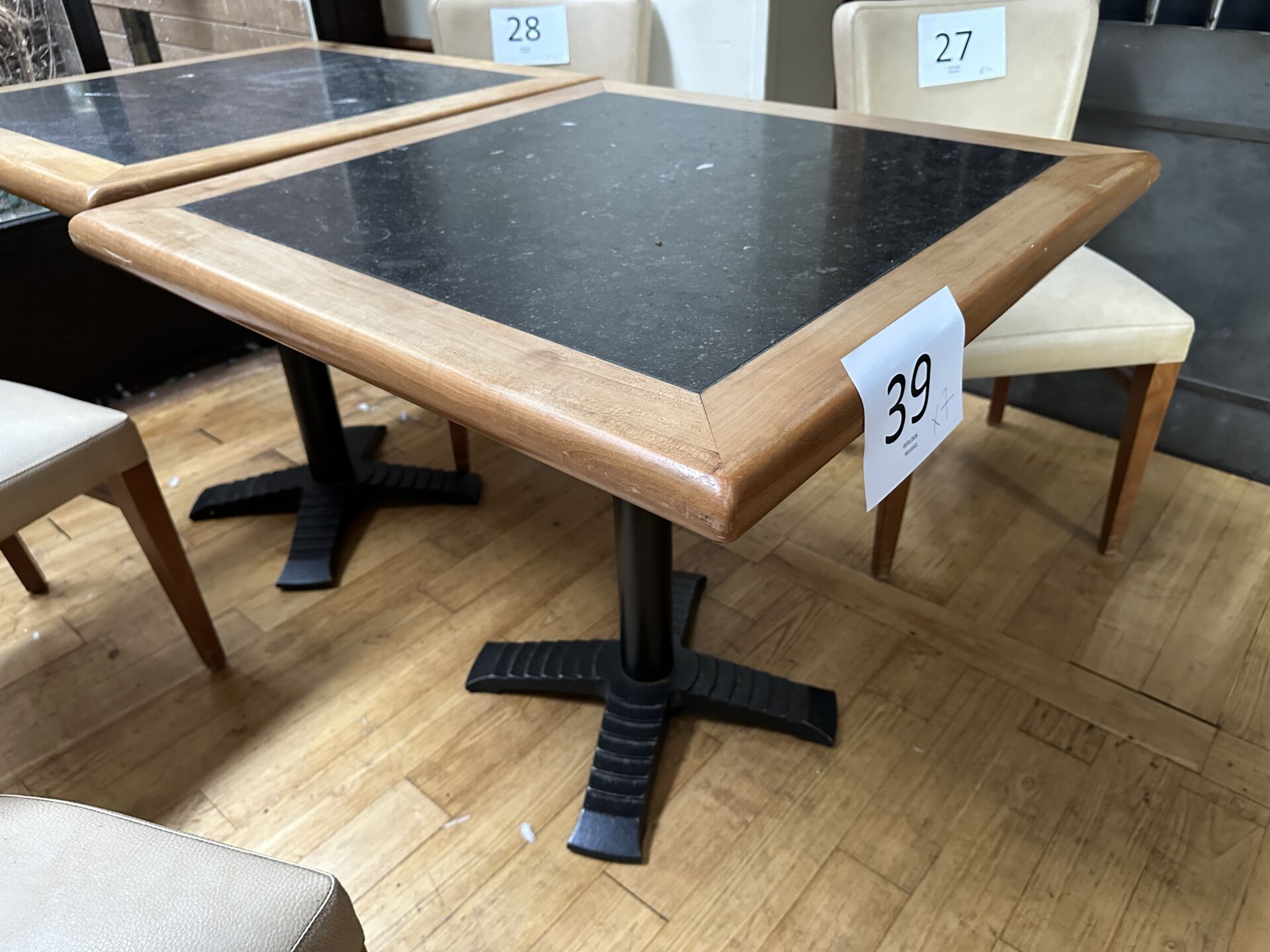 7 tables 4 couverts bois et façon granit piètement métal noir, 80x120cm