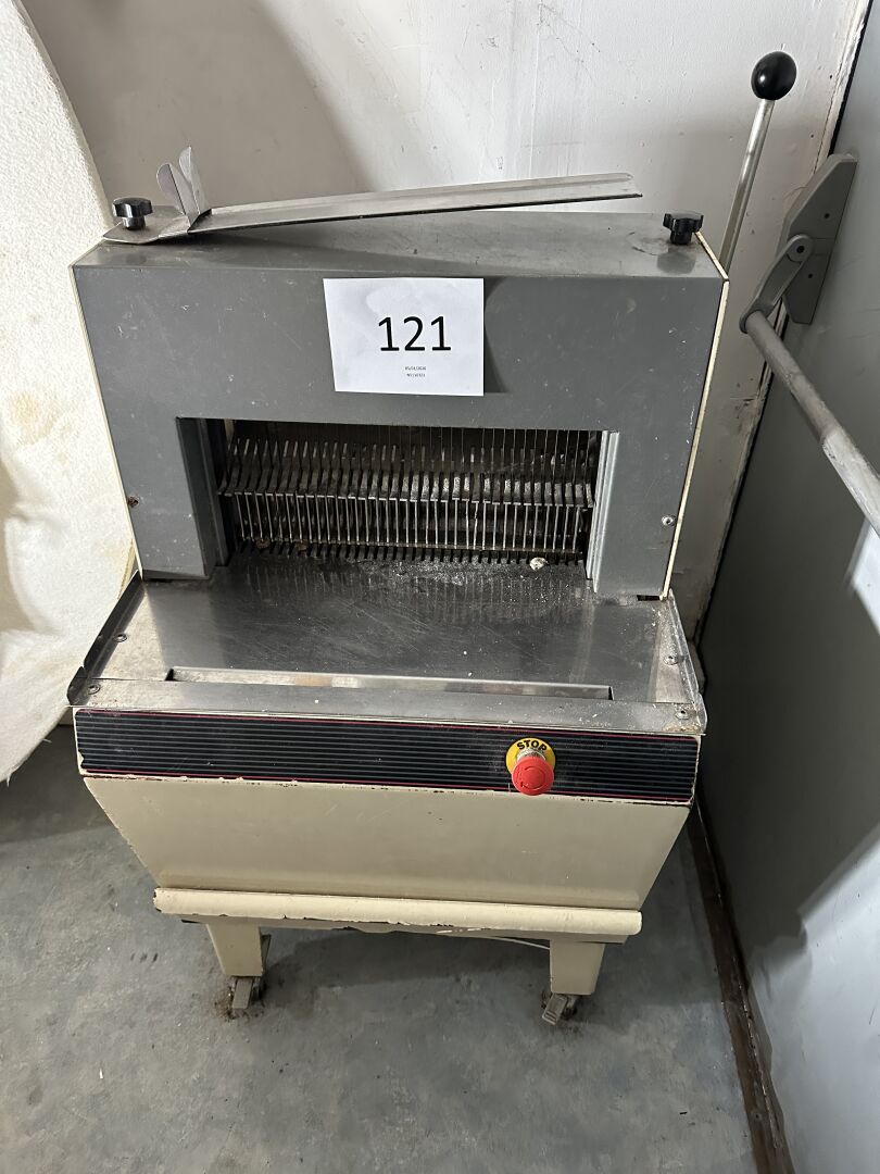 1 trancheuse à pain mobile sans marque ni plaque apparente (état de fonctionnement inconnu)