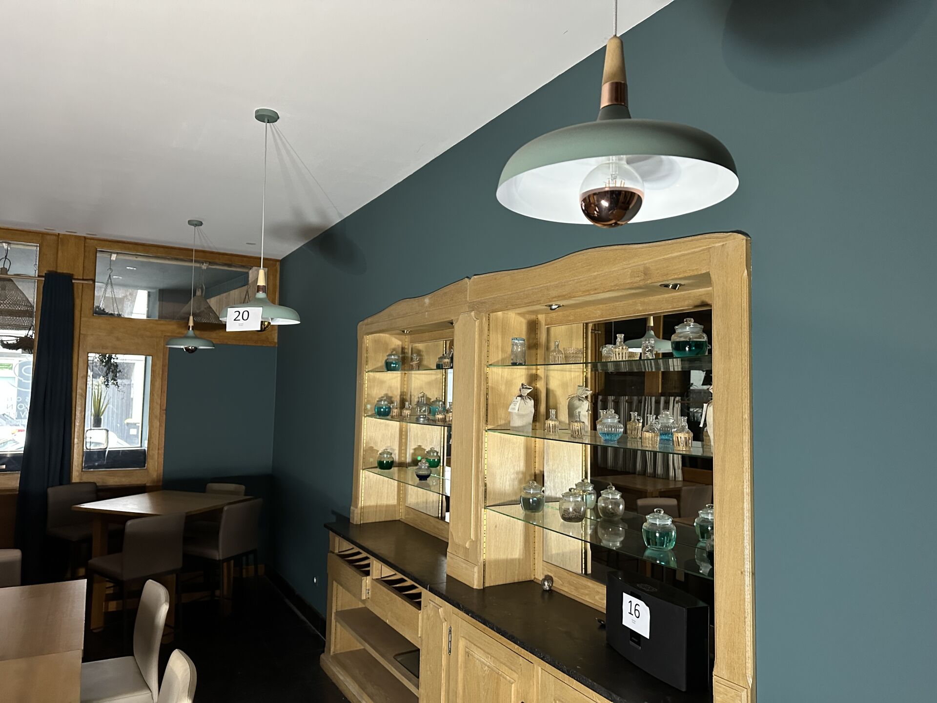 Dans un salon : 1 ensemble d’objets décoratifs dont pots et fioles en verre, 3 rideaux ...