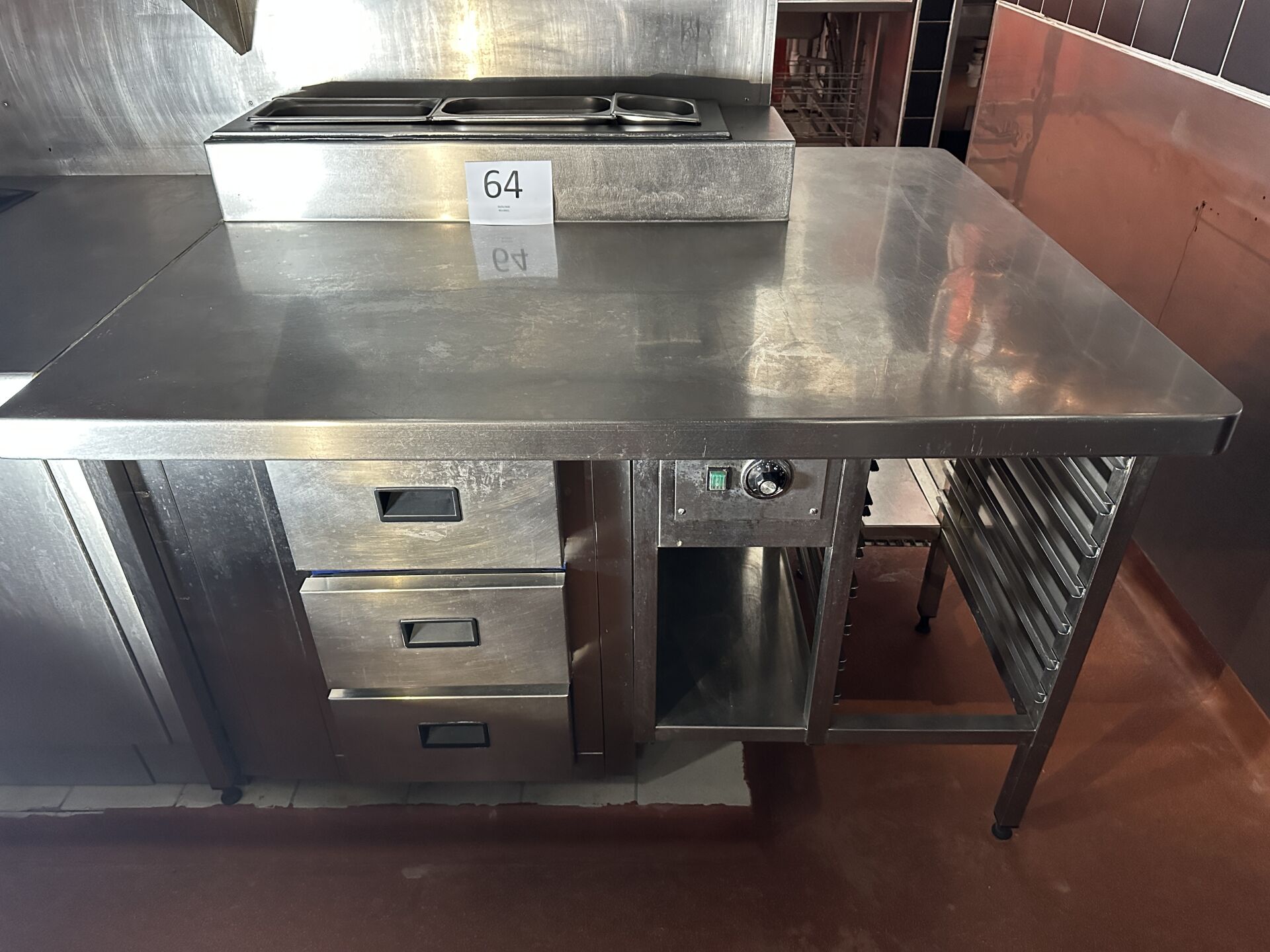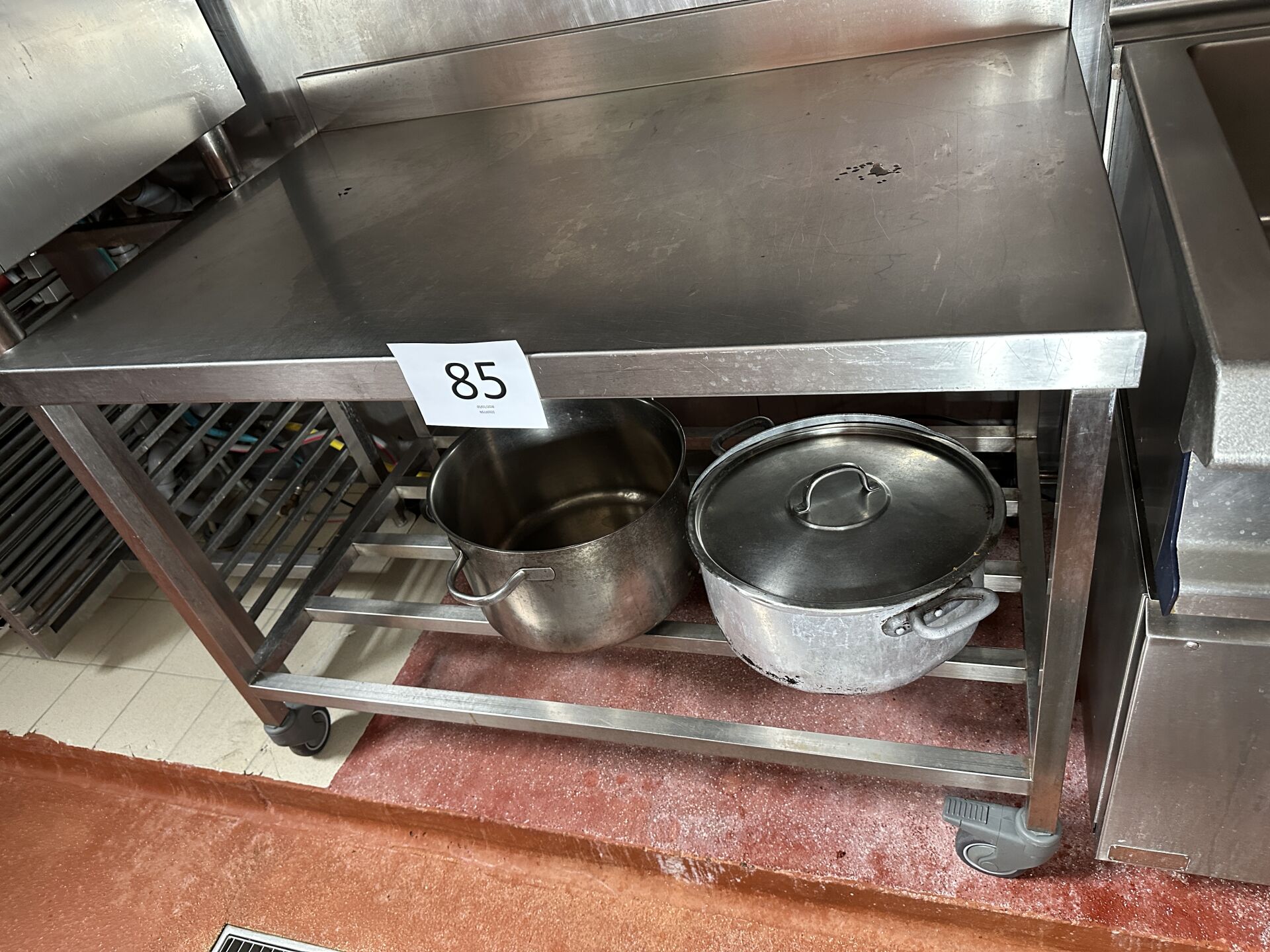 1 table de travail mobile inox à dosseret et plateau d’entrejambe, 132x85cm