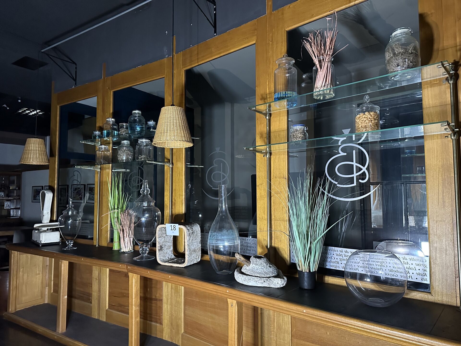 sur une mezzanine : 1 balance à grains ancienne, 1 marie-jeanne, 1 amphore, pot en cuivre,...