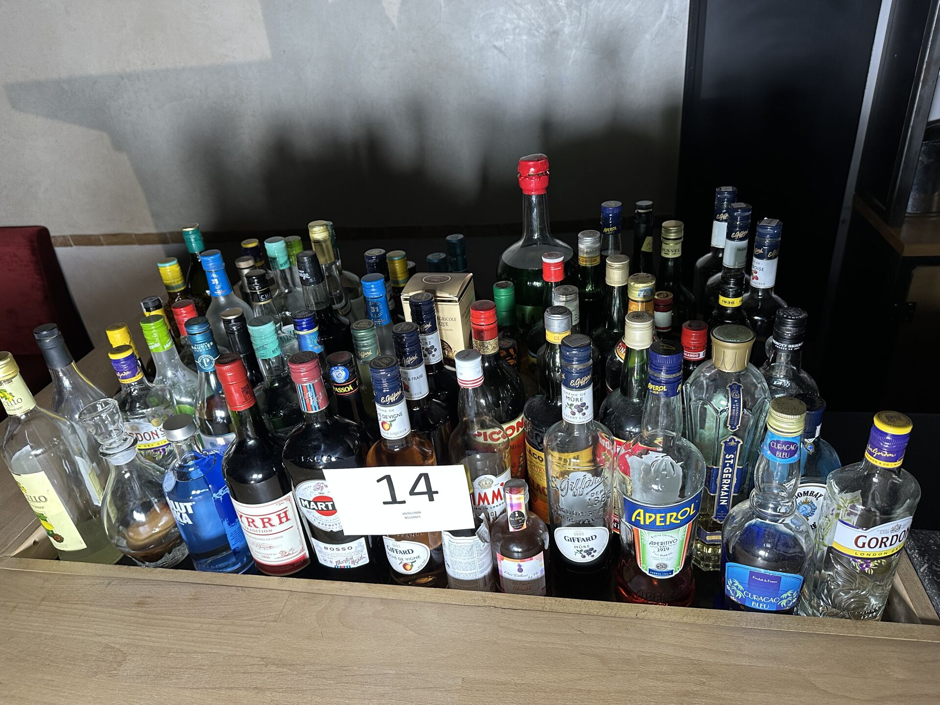 Environ 60 bouteilles de boissons alcoolisées dont entamées : apéritifs, digestifs, liqueurs,...