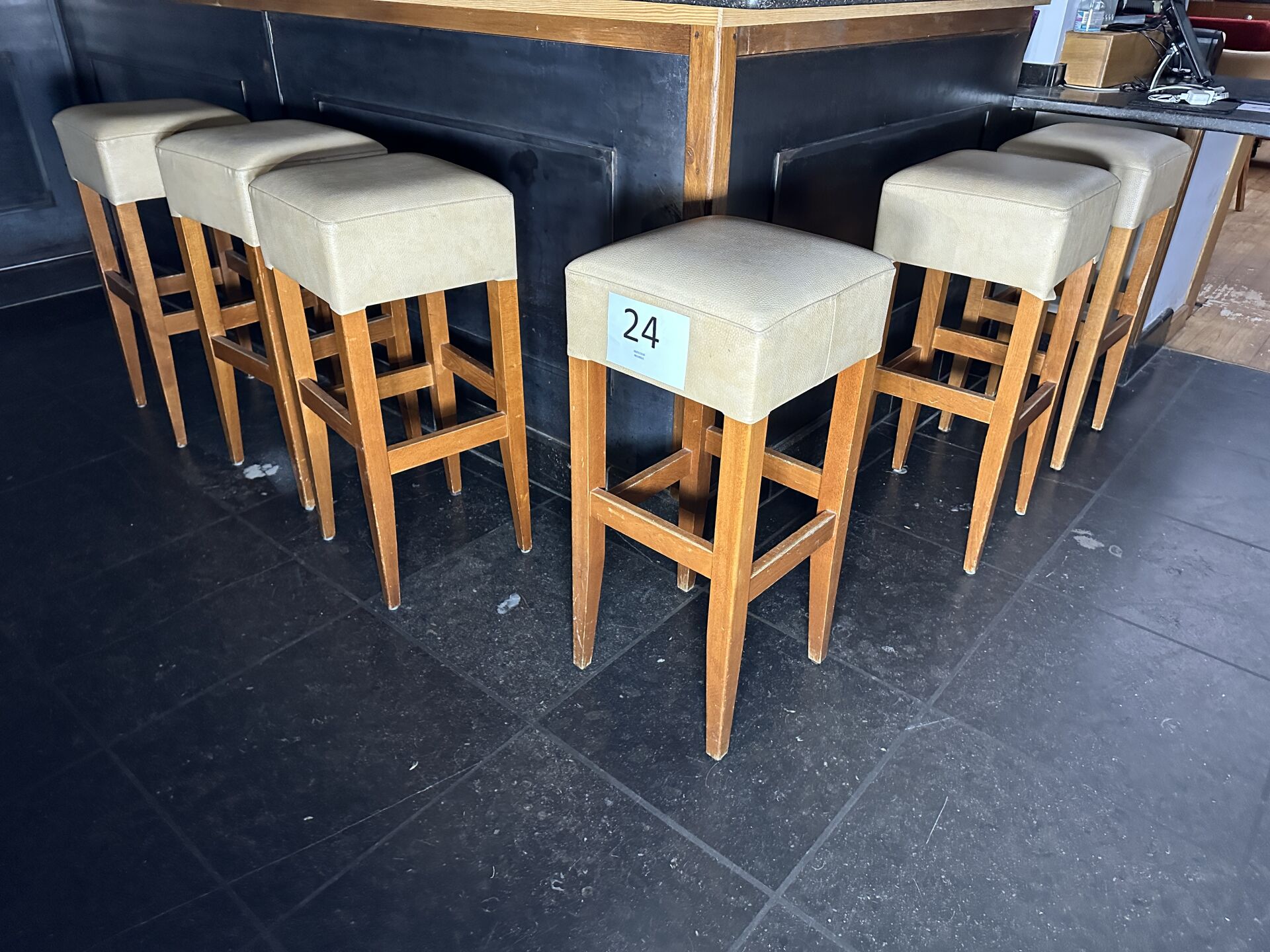7 tabourets de bar simili cuir beige, piètement bois