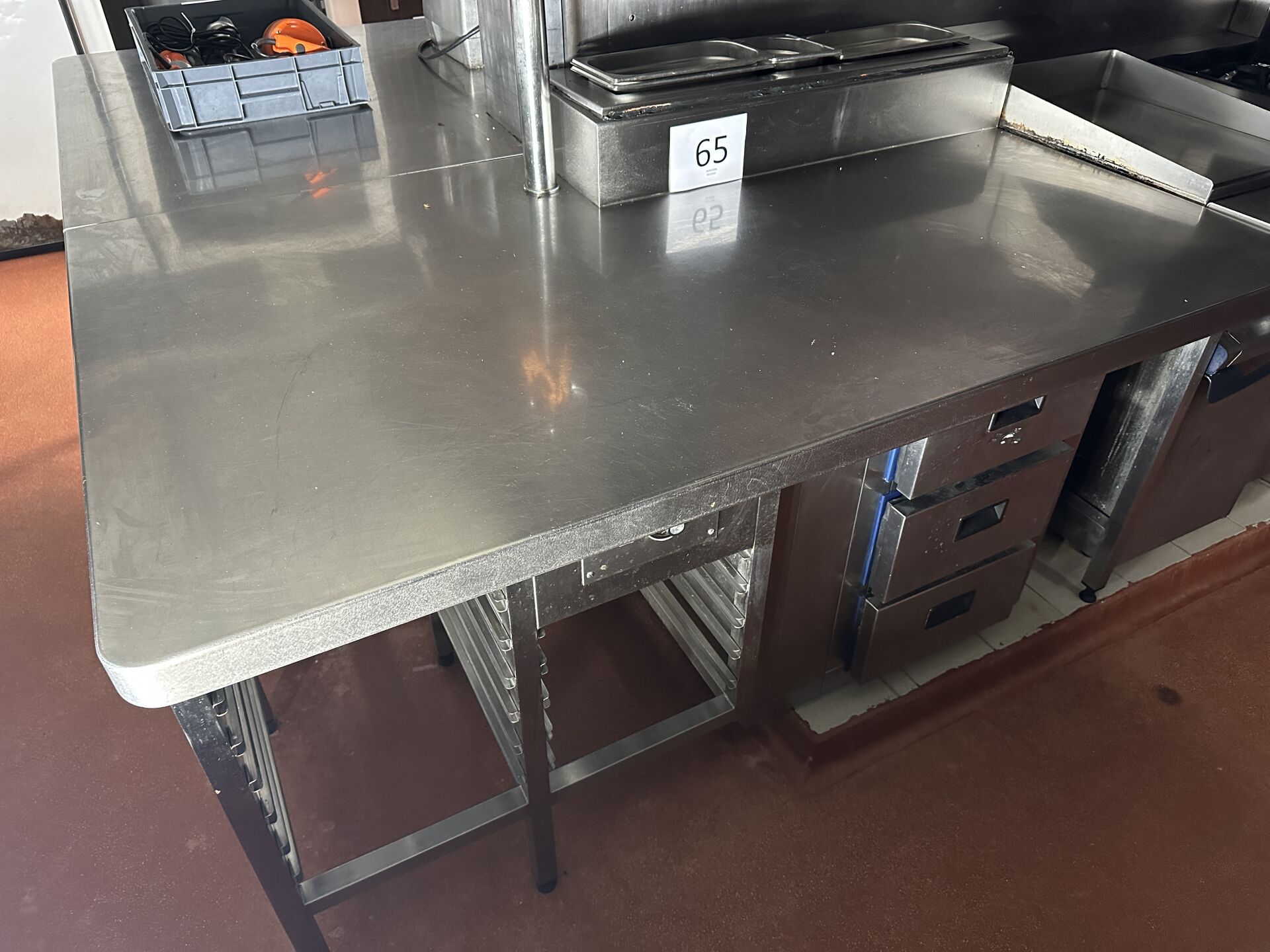 1 plan de travail inox en angle avec étagères à plateaux en partie basse 190 x 115 cm,...