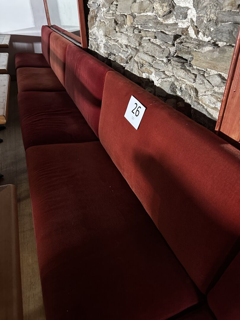 5 banquettes tissu velours rouge dim : 200 cm (x1), 180 cm (x1), 150 cm (x1) et 110 cm (x2)