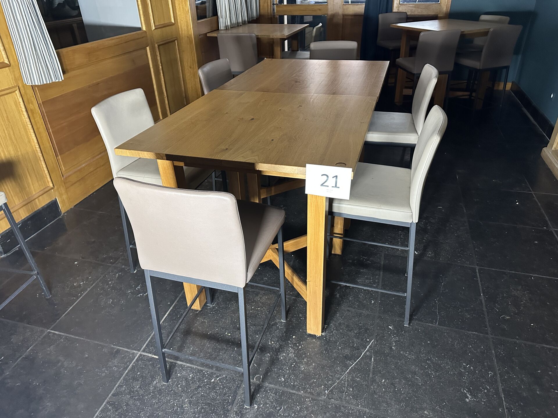 2 tables hautes bois 90 x 90 cm, 6 chaises hautes simili cuir beige piètement métal noir