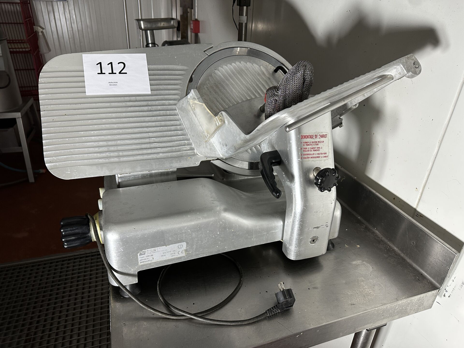 1 trancheuse à jambon alu MANICONI type 350 IM avec gant anti-coupure en cotte de mailles