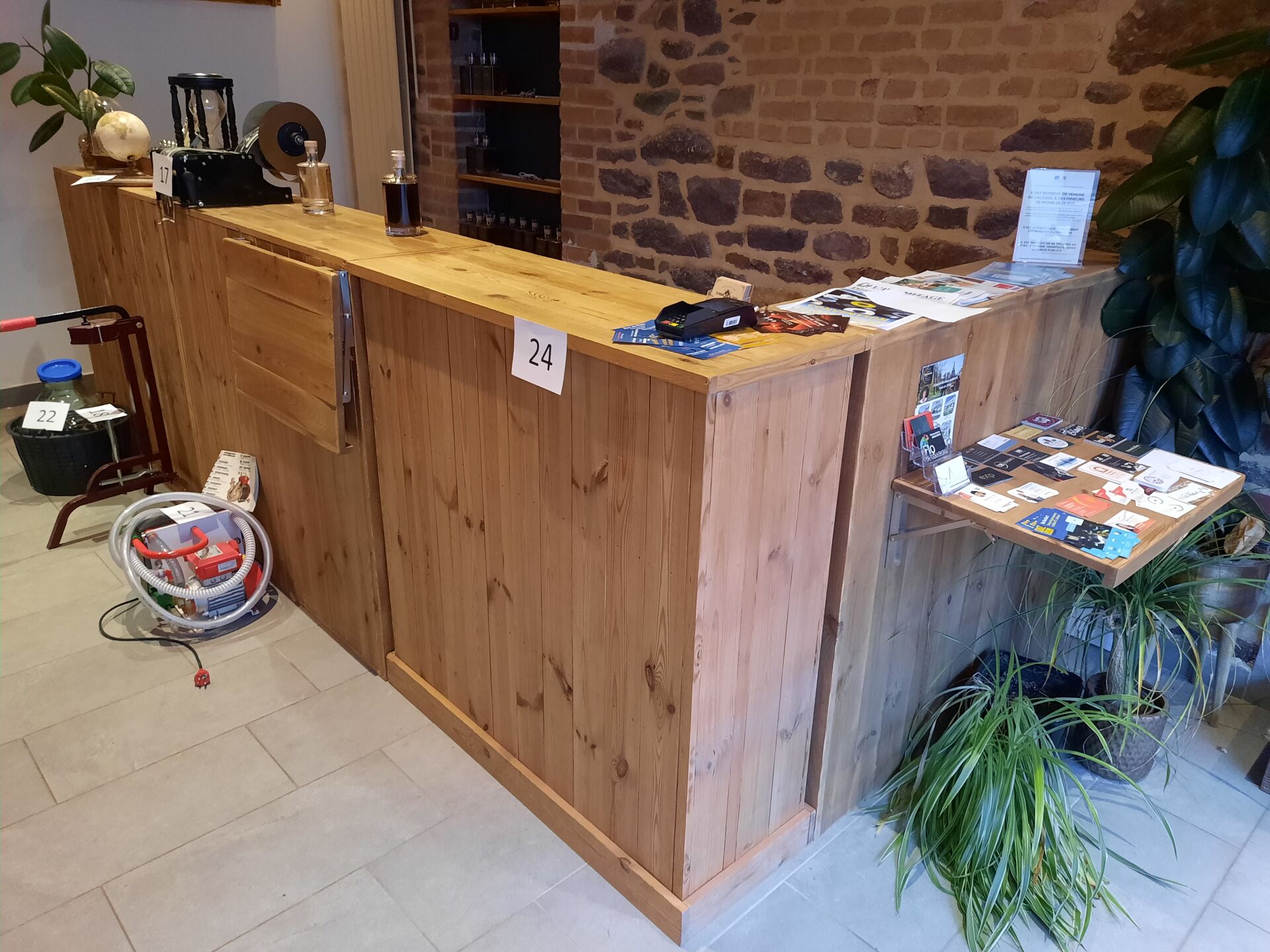 Banque d’accueil formant angle en pin (348 x 160 cm) composée de 4 modules indépendants...