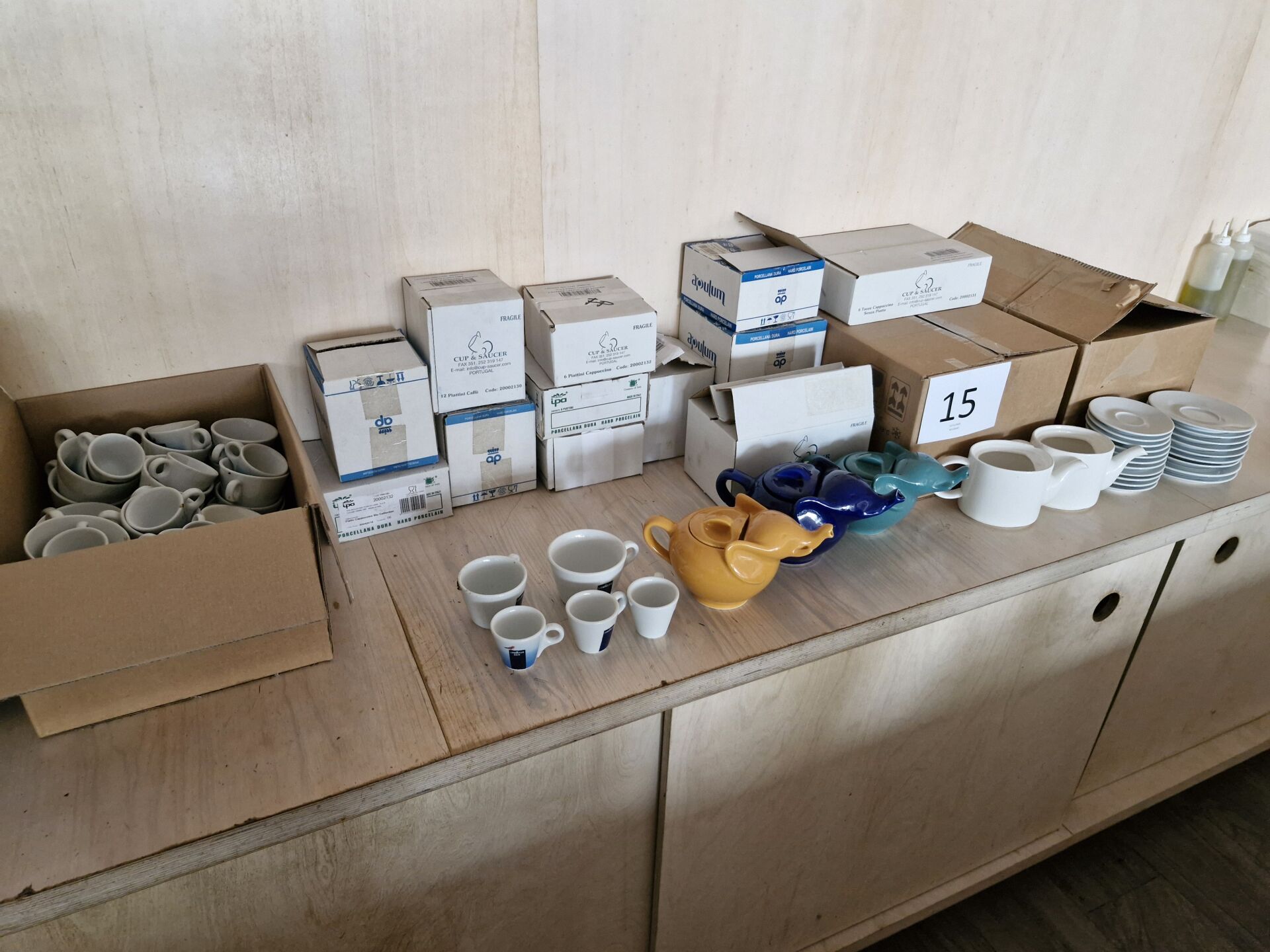 1 stock de tasses et sous-tasses à café, thé, dont LAVAZZA (environ 30 unités) , 3 théières...
