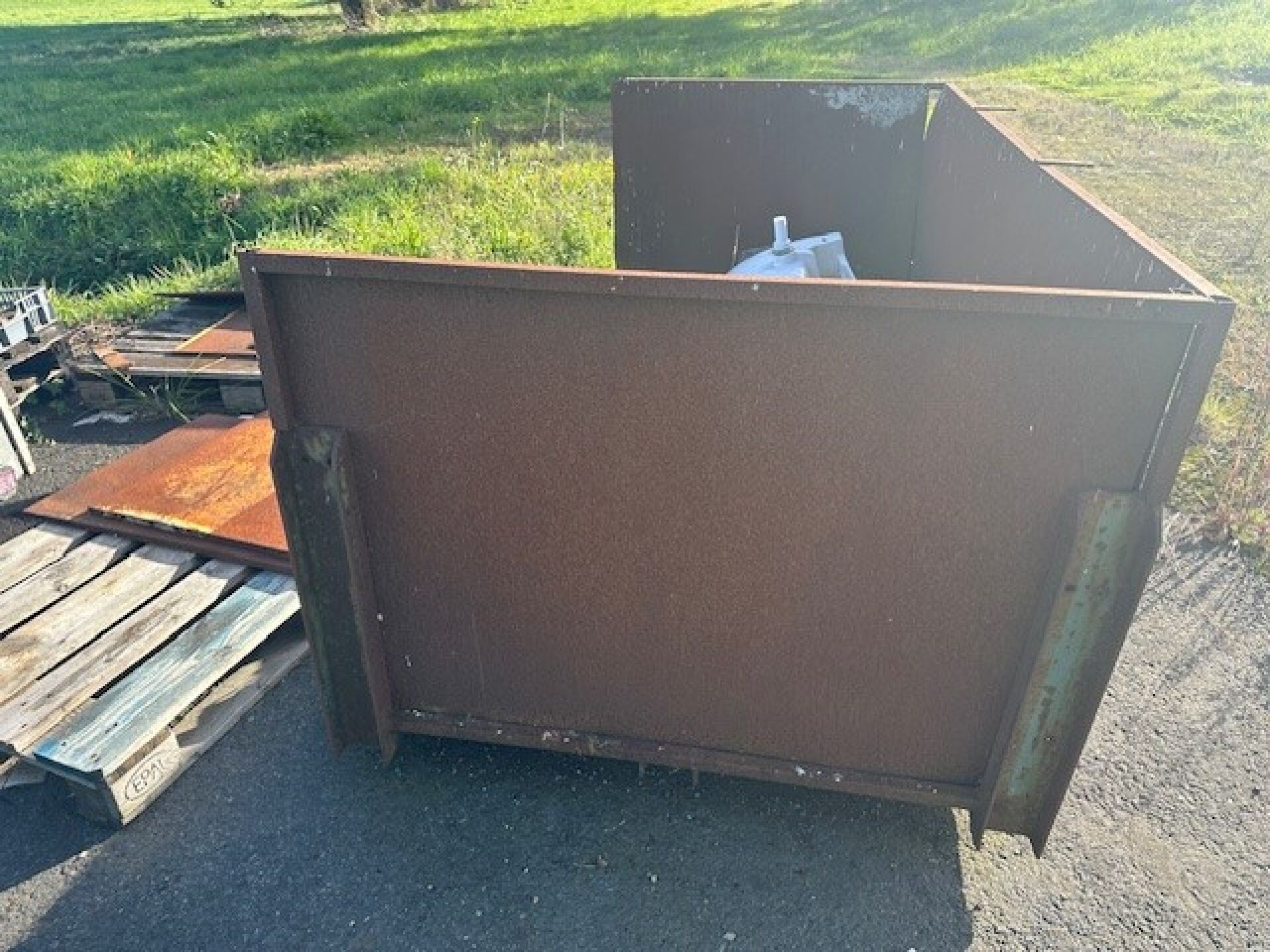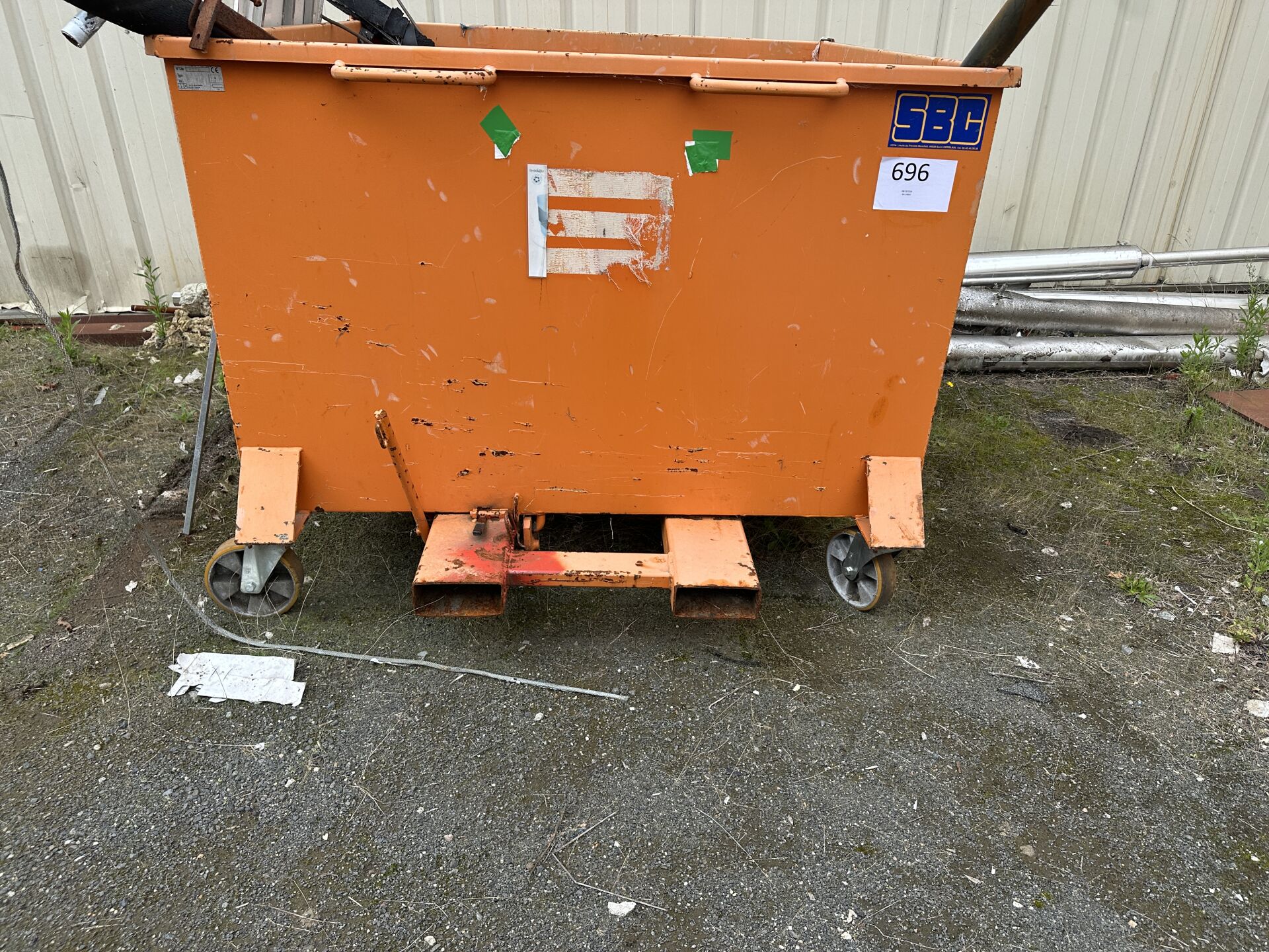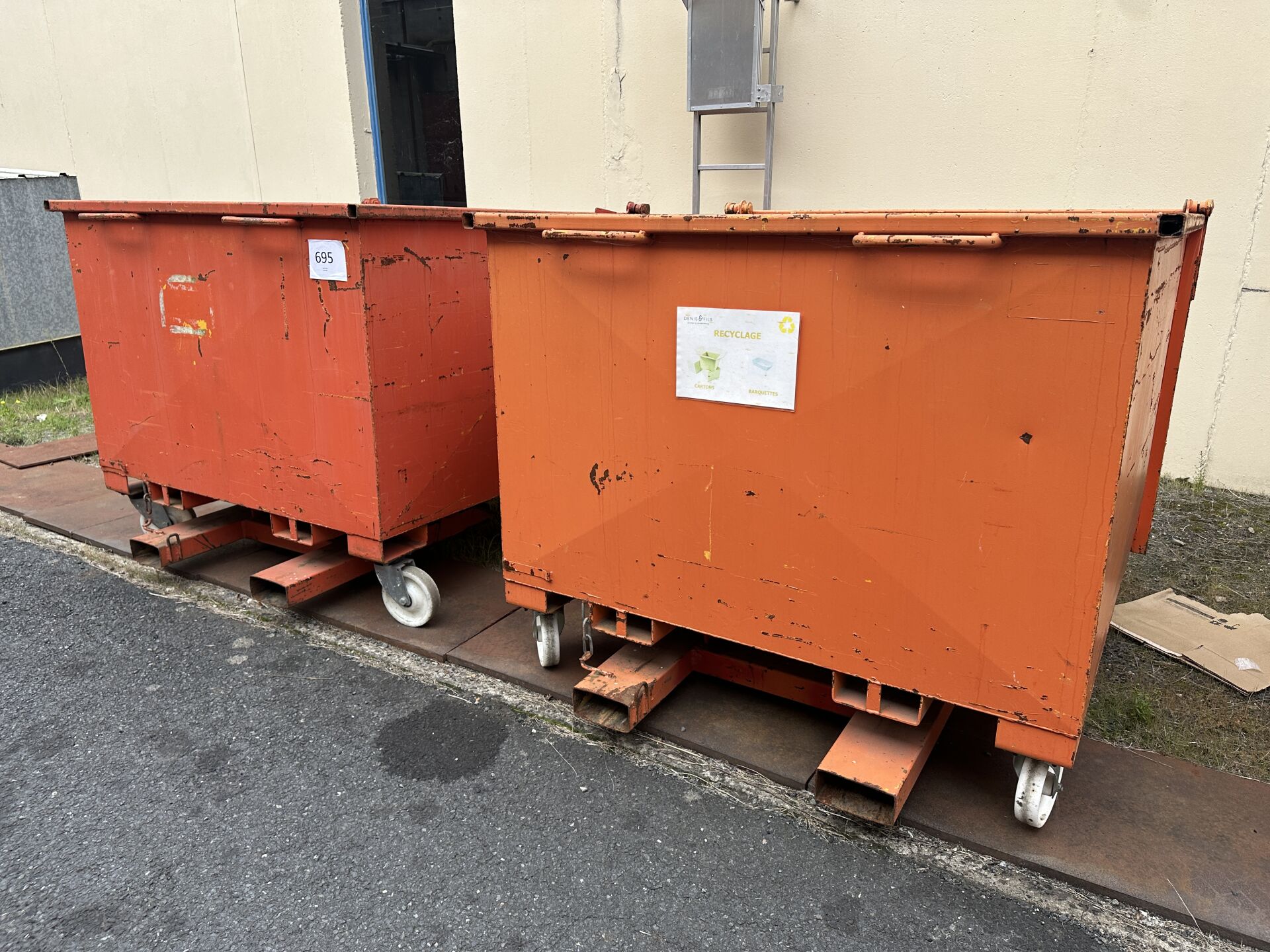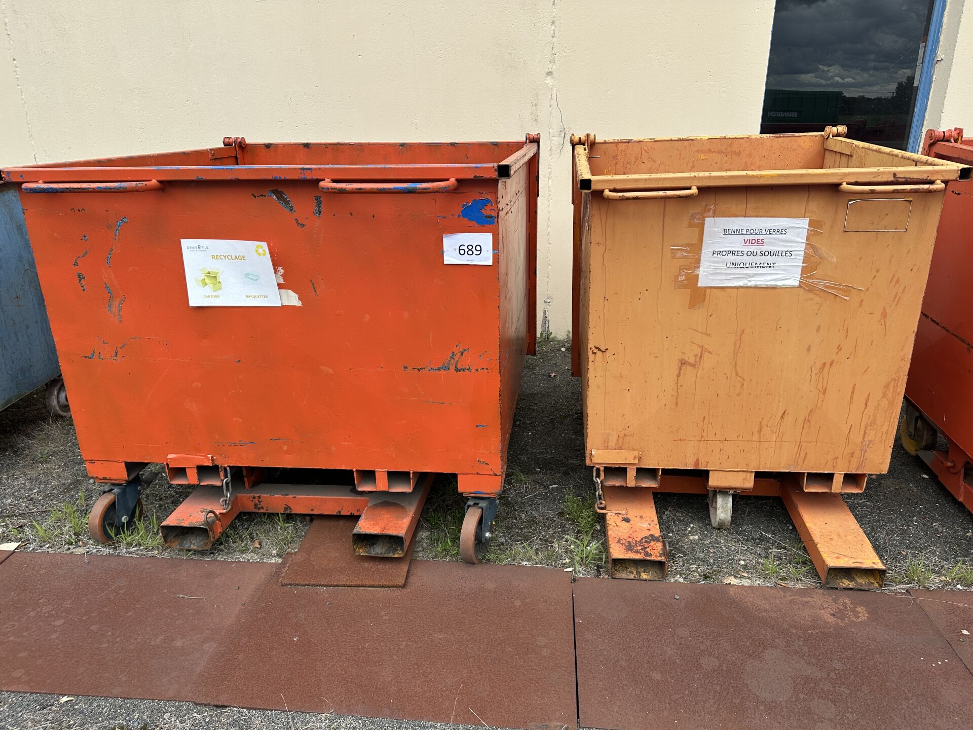 2 bennes mobiles métal orange prise de fourche SBC basculantes : 1 en 1500 L et 1 en 2140 L Adjugé à : €