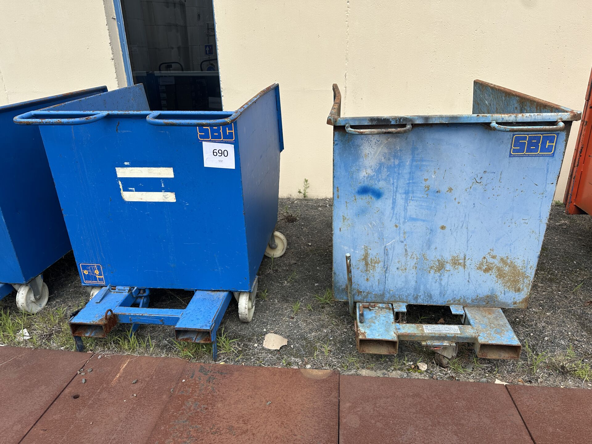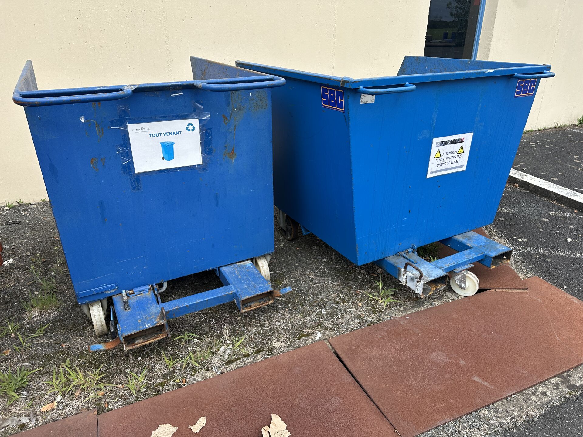 2 bennes mobiles métal bleu prise de fourche SBC basculantes : 1 en 1500 litres, 1 en 1800...