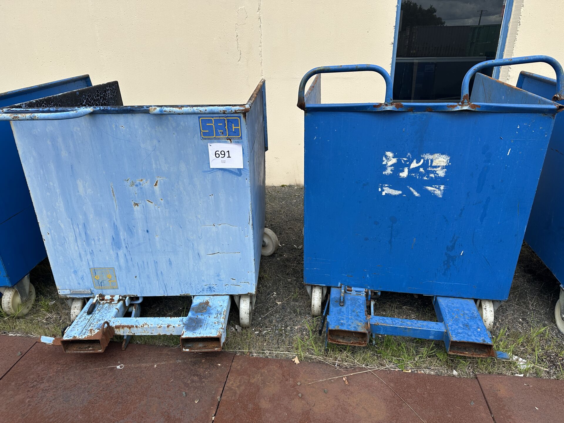 2 bennes mobiles métal bleu prise de fourche SBC basculantes 1500 litres, PV 300 KG