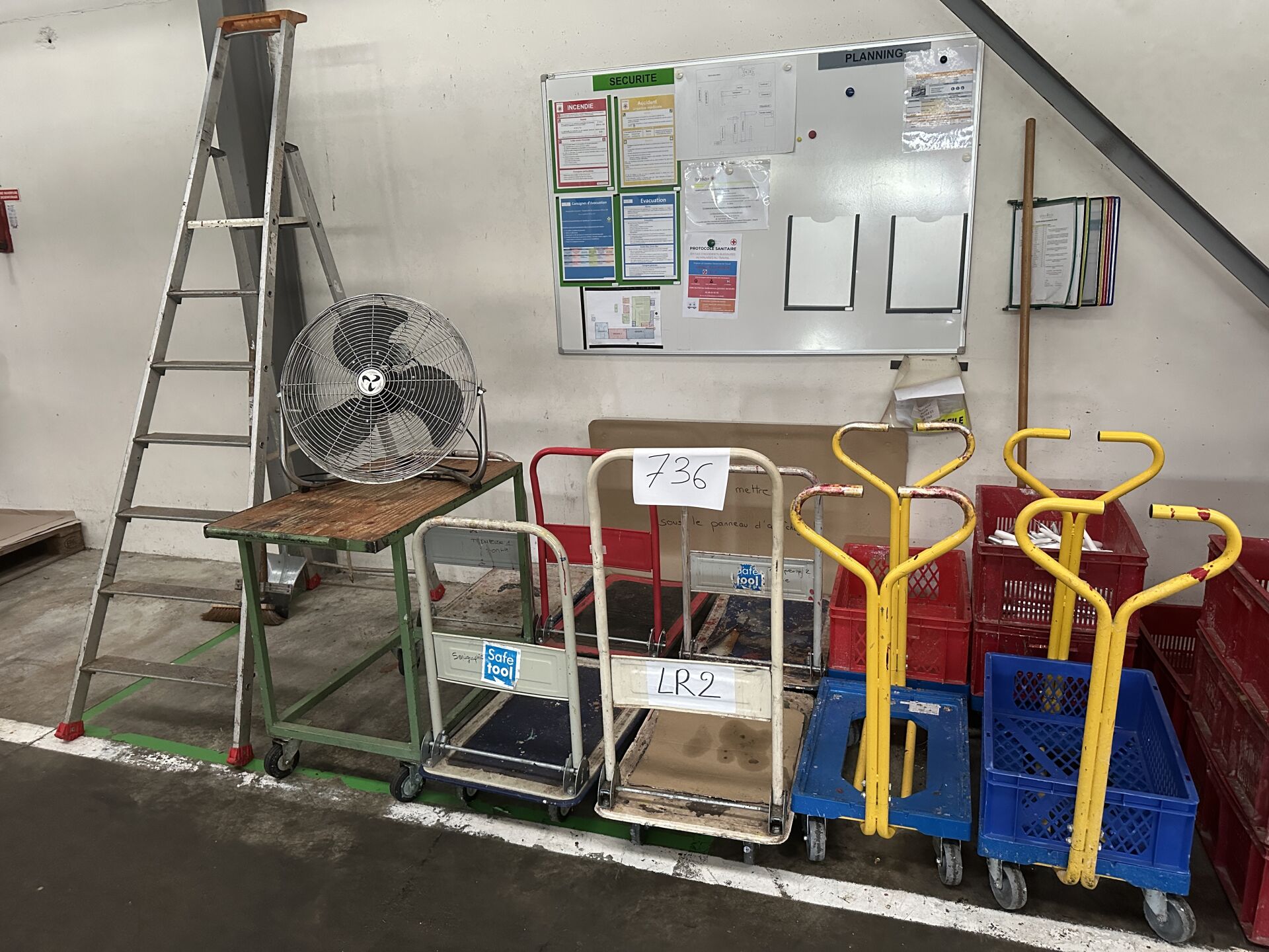 5 chariots de type archive, 1 chariot/desserte plateau bois, métal vert, 4 chariots porte caisse...