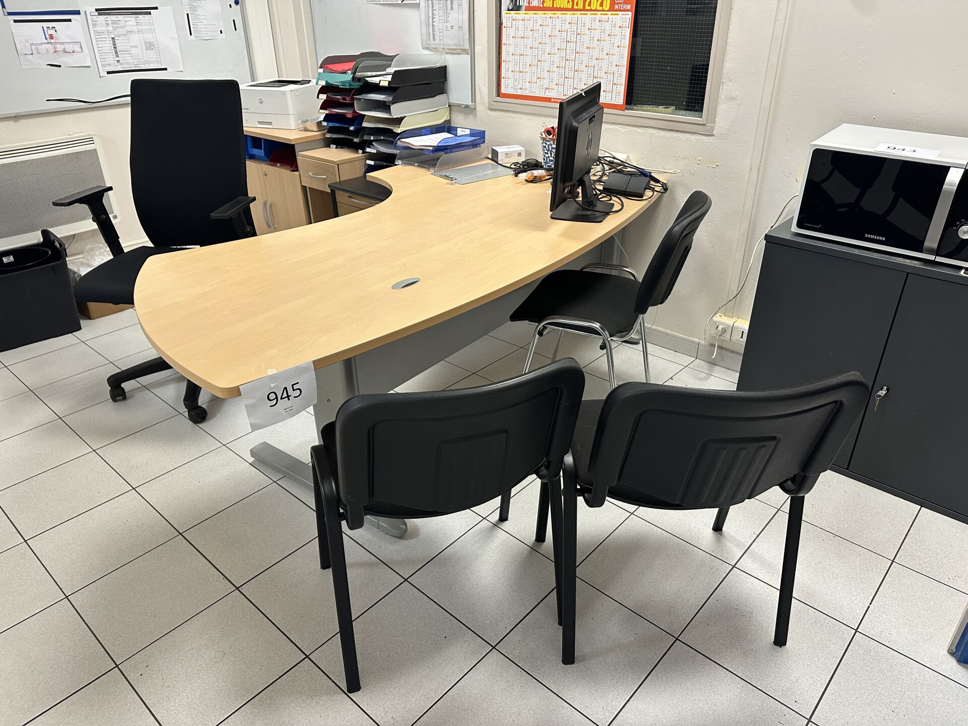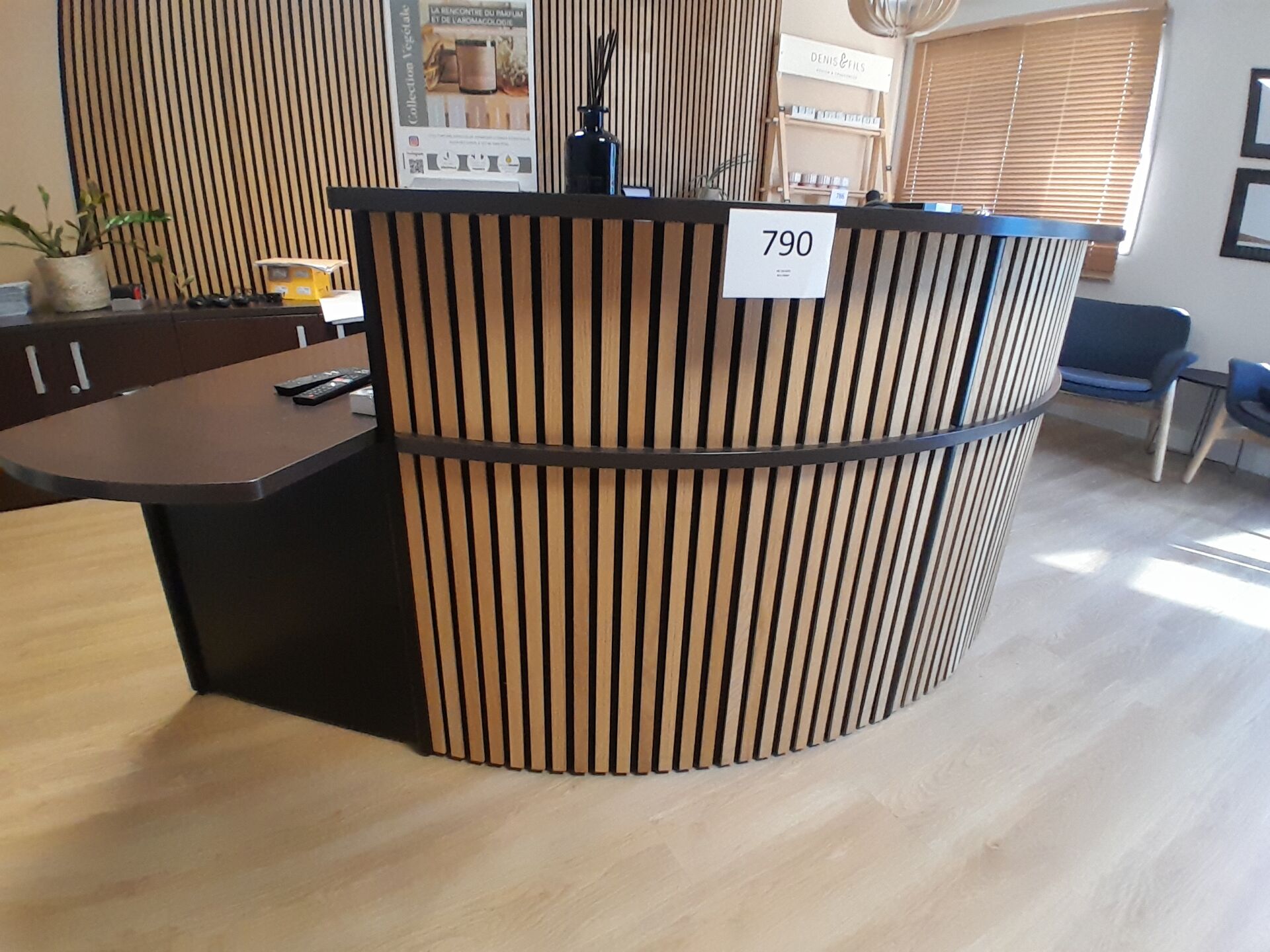 1 comptoir d’accueil en arrondi 4 modules mélaminé façon bois foncé et clair 250 x 270...