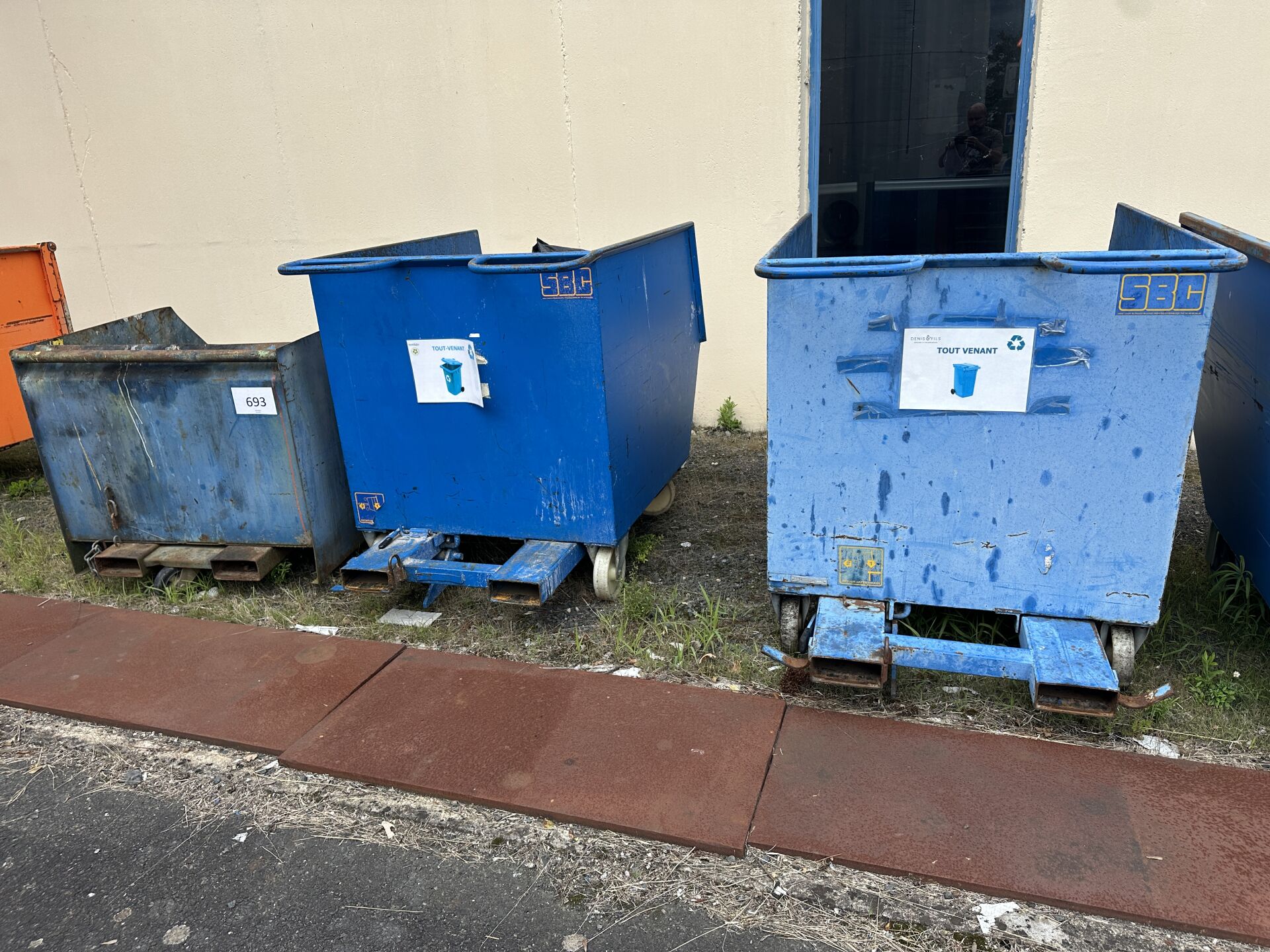 3 bennes mobiles métal bleu prise de fourche SBC basculantes: 2 en 1500 litres, PV 300 KG et 1...
