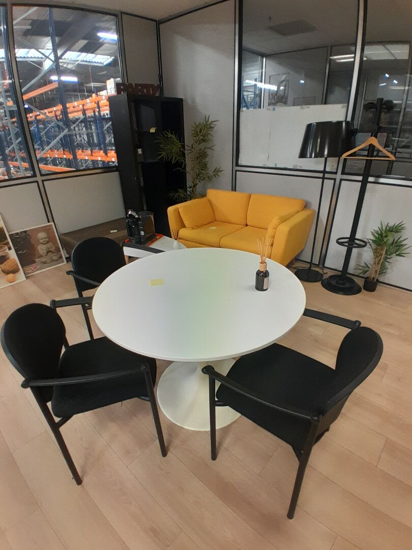 1 ensemble de mobilier mélaminé blanc comprenant 2 mange-debouts diam 60 cm, 5 chaises hautes,...