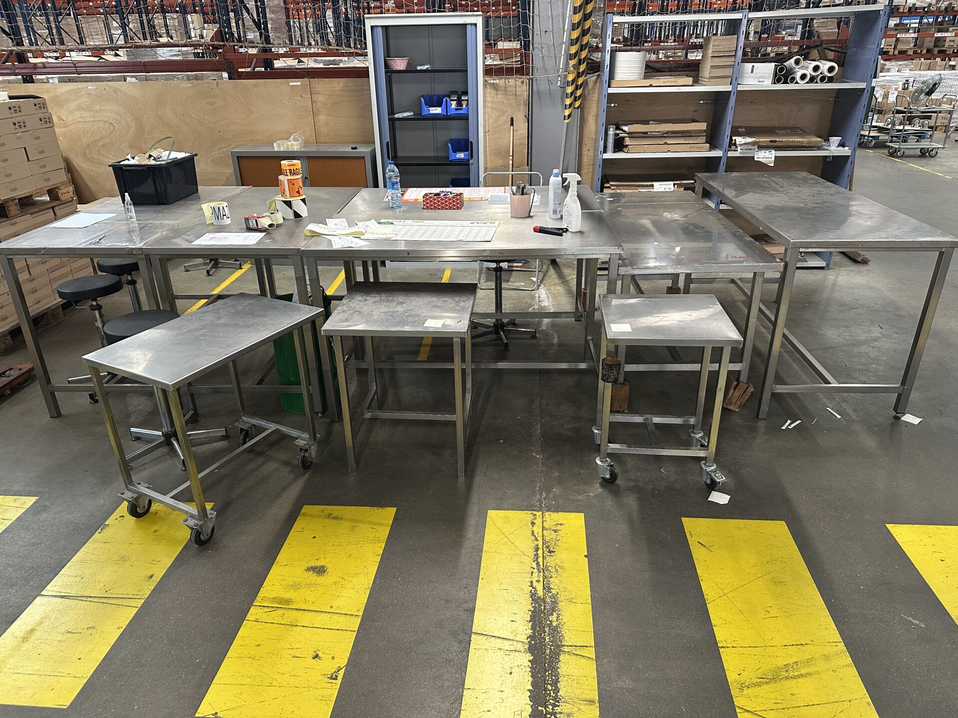 1 lot de 6 tables inox (180 x 75 cm et 150 x 75 cm) et 3 dessertes inox (60 x 60 cm et 50 x 50...