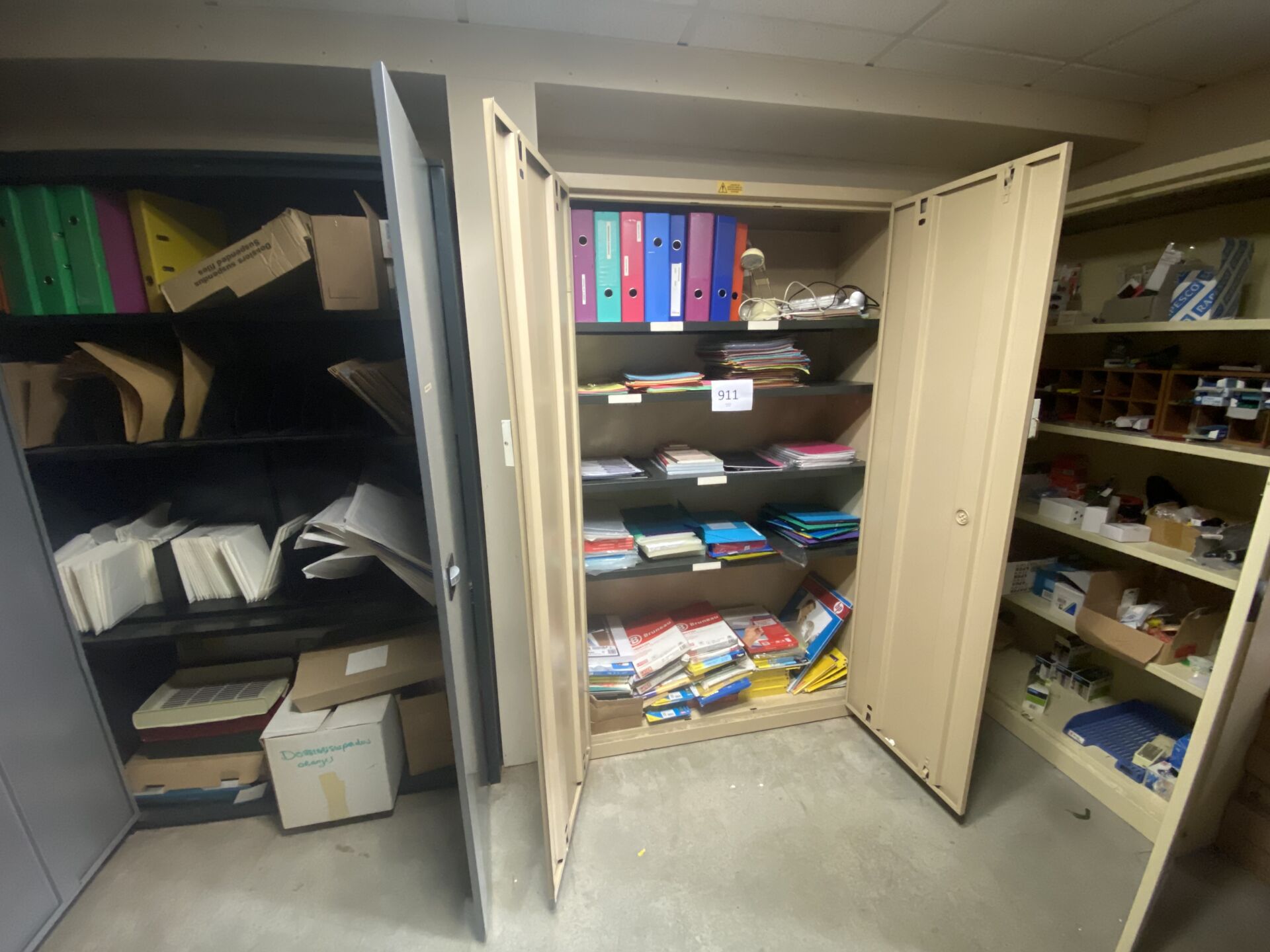Dans 3 armoires : 1 stock de fournitures de bureau (classeurs, chemises, étiquettes, porte...