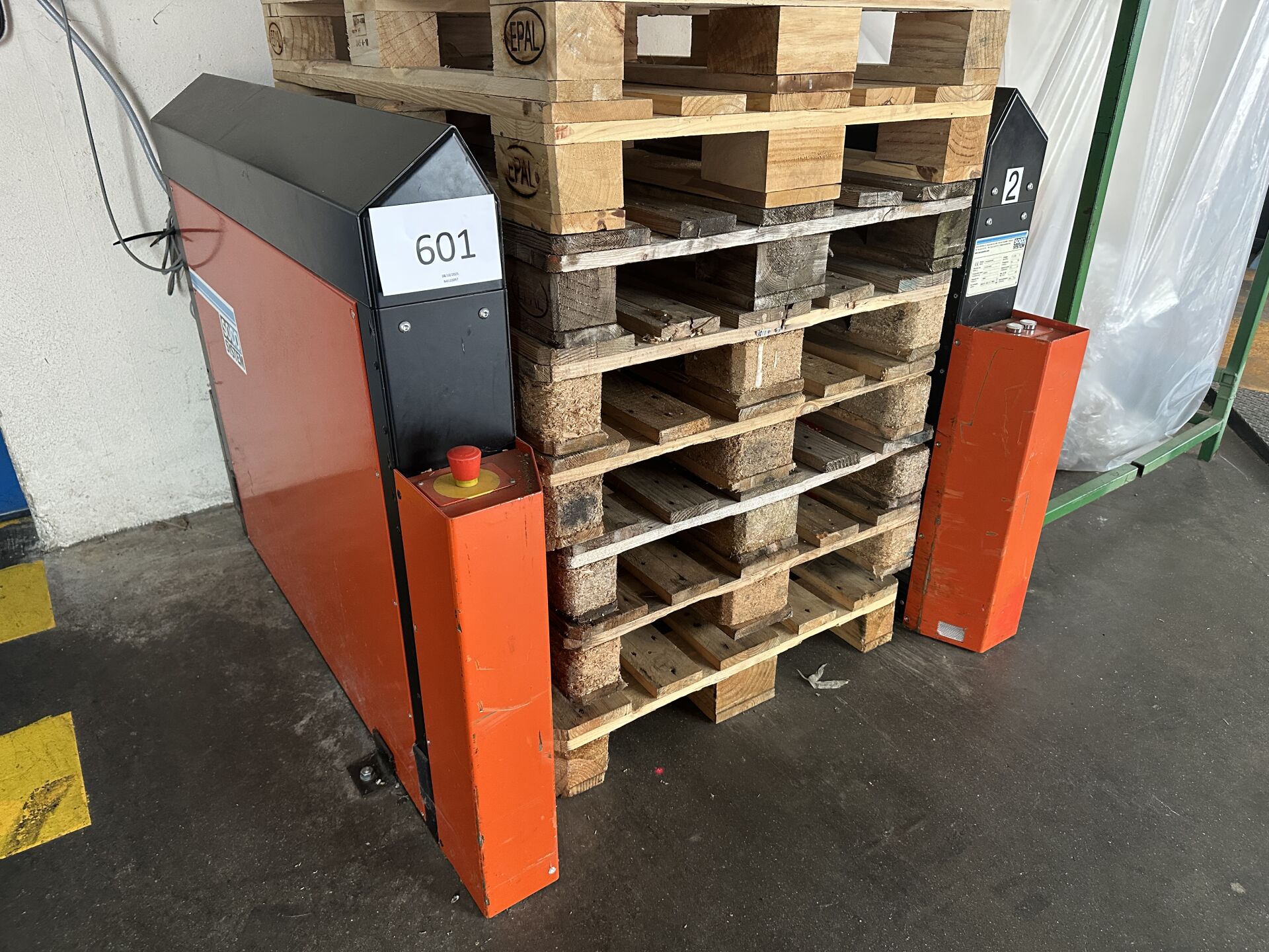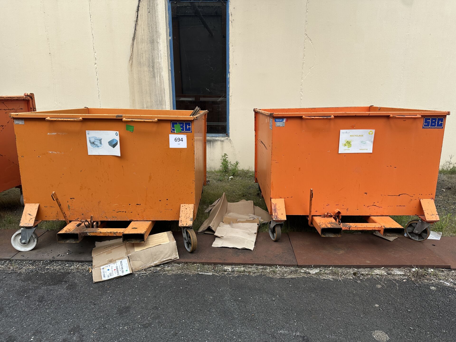2 bennes mobiles métal orange prise de fourche SBC basculantes : 1 en 2300 L et 1 en 2140 L Adjugé à : €