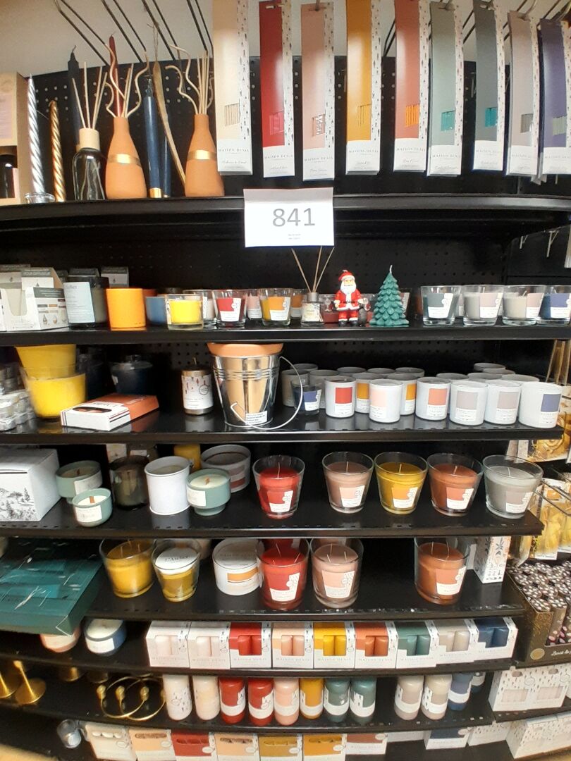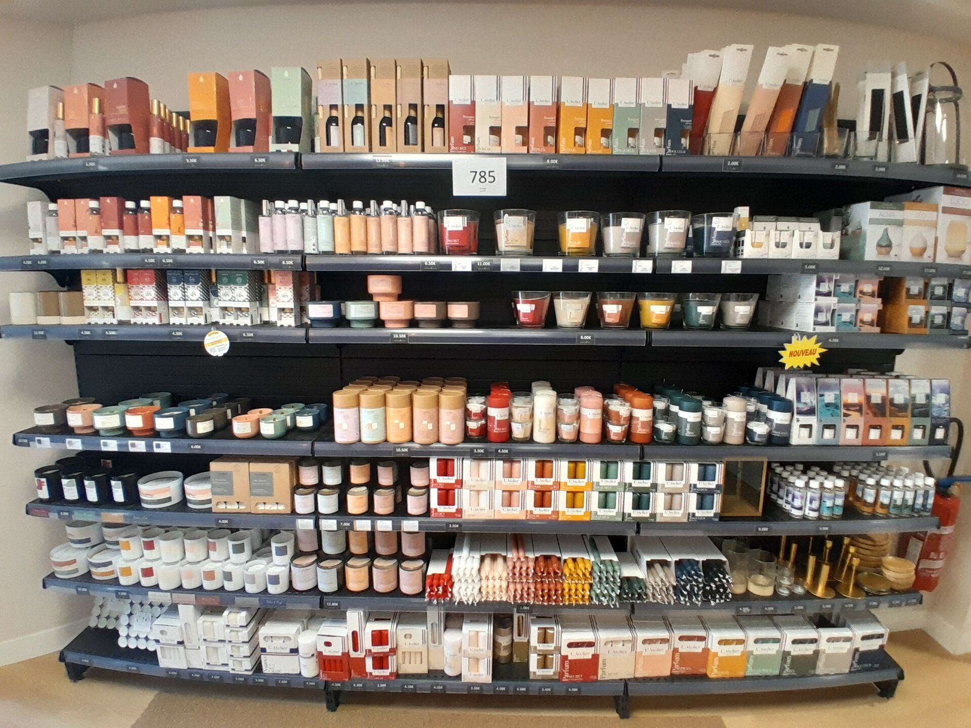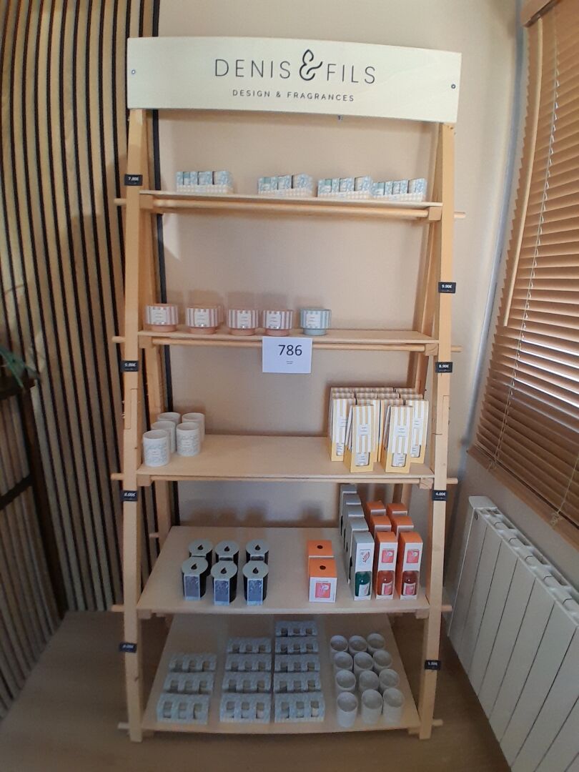 Sur 2 étagères : 1 petit stock de bougies et parfums d’ambiance MAISON DENIS et COMPAGNIE...